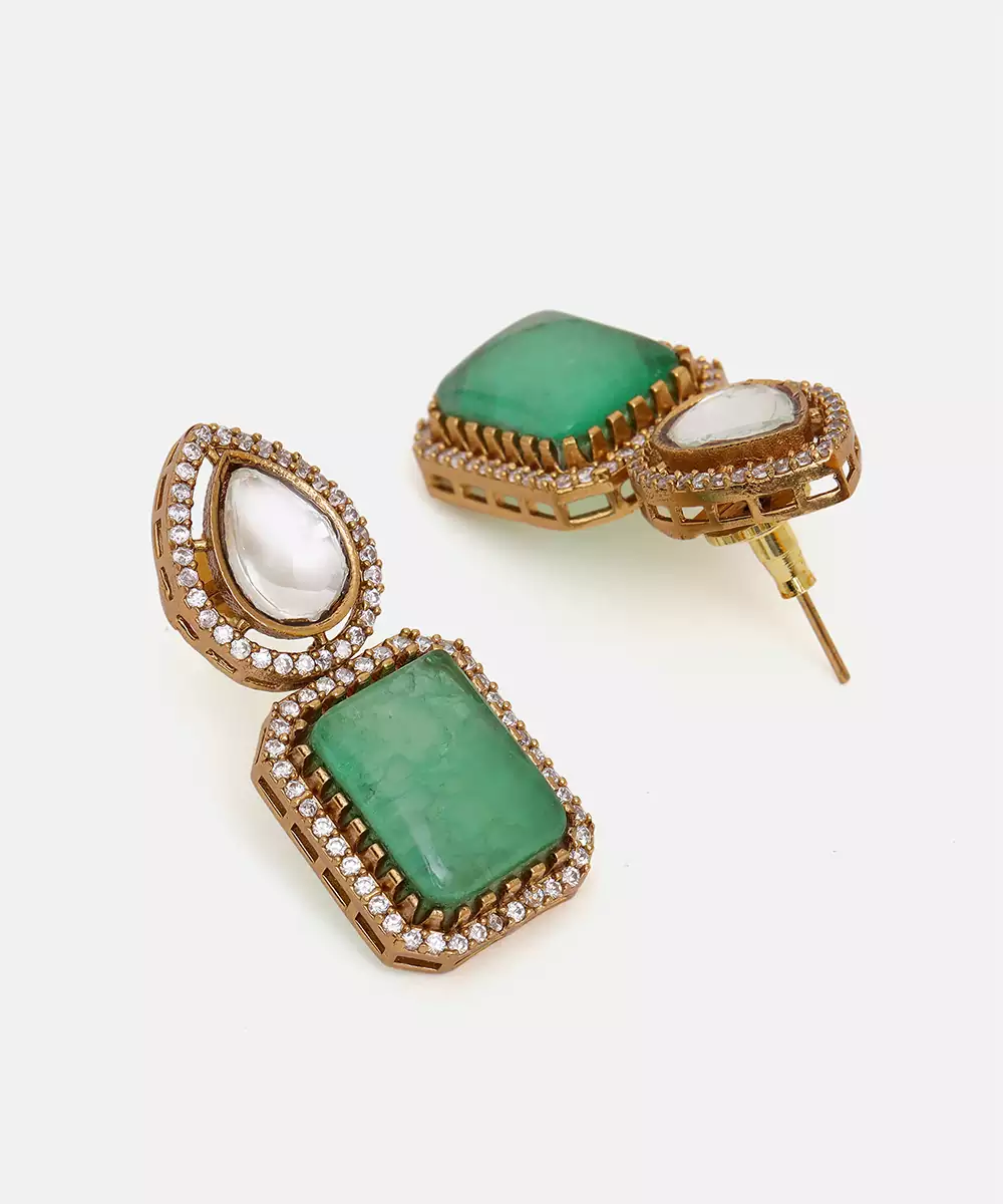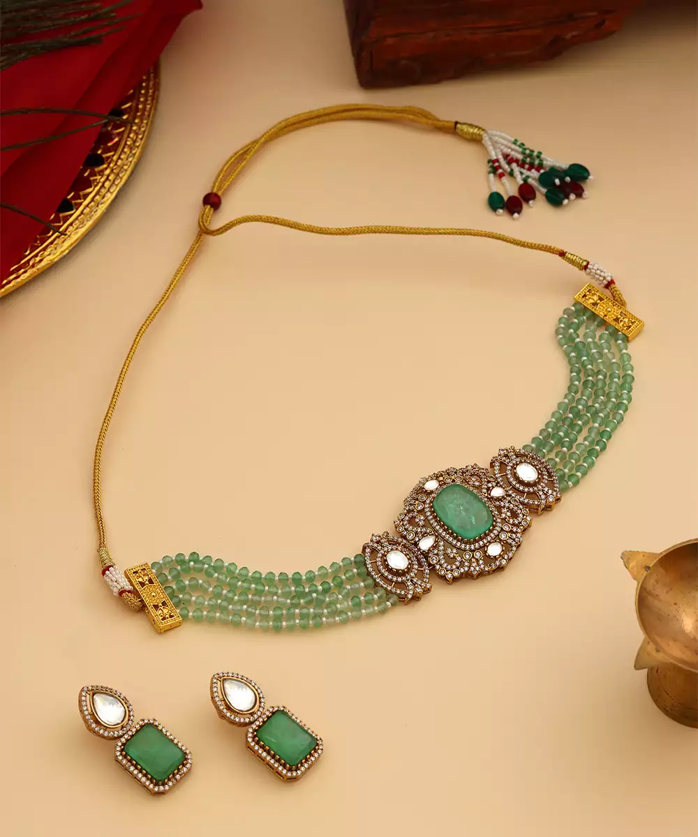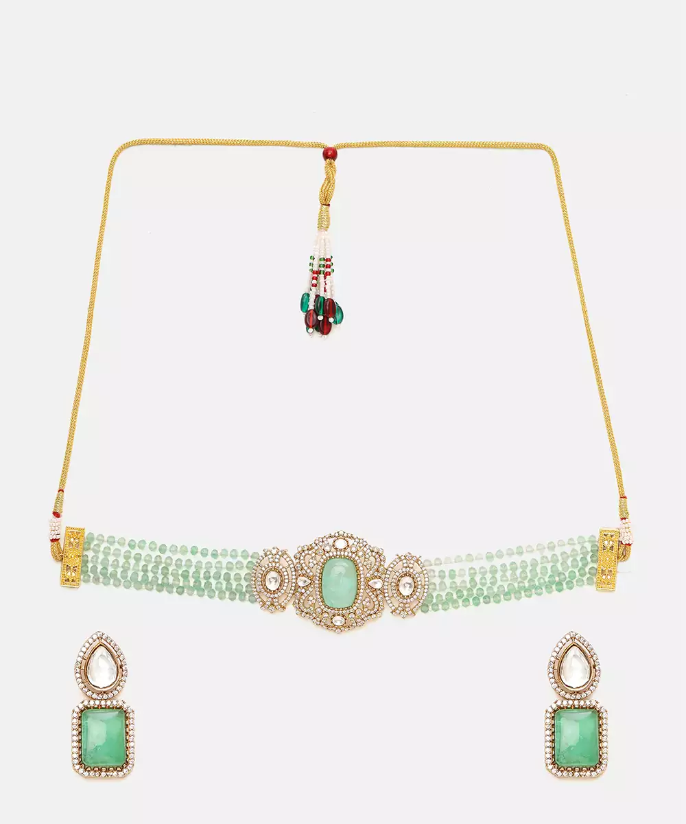 This Green Gold Kundan Necklace Set Radiates Regal Elegance With Its Intricate Craftsmanship And Rich Detailing. Adorned With Classic Kundan Work And Vibrant Green Accents, It Adds A Festive, Traditional Charm. Perfect For Weddings, Celebrations, And Special Occasions, It Beautifully Complements Ethnic And Bridal Ensembles With Timeless Sophistication.
