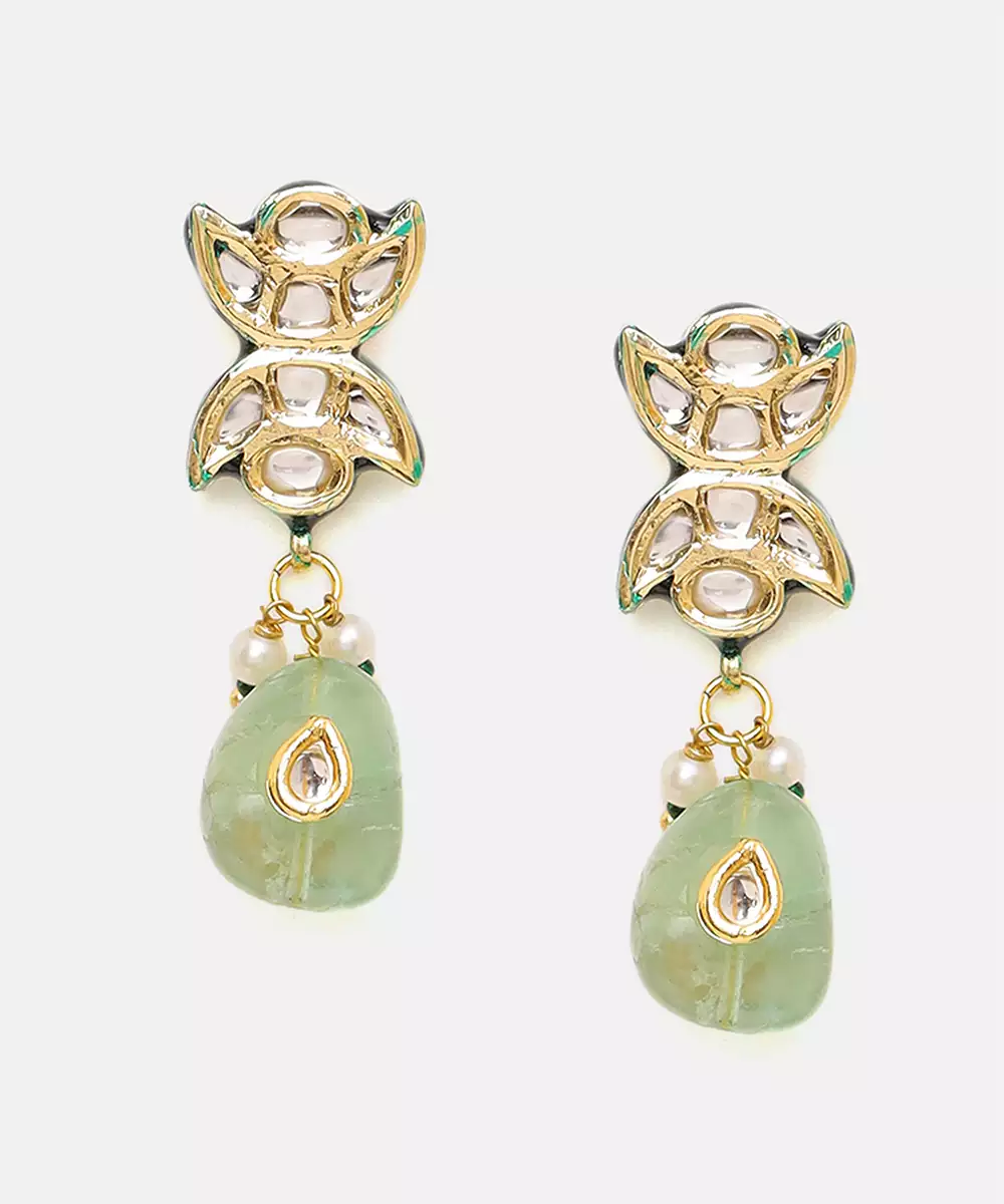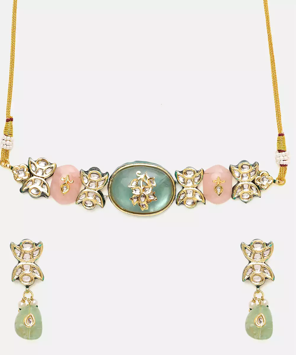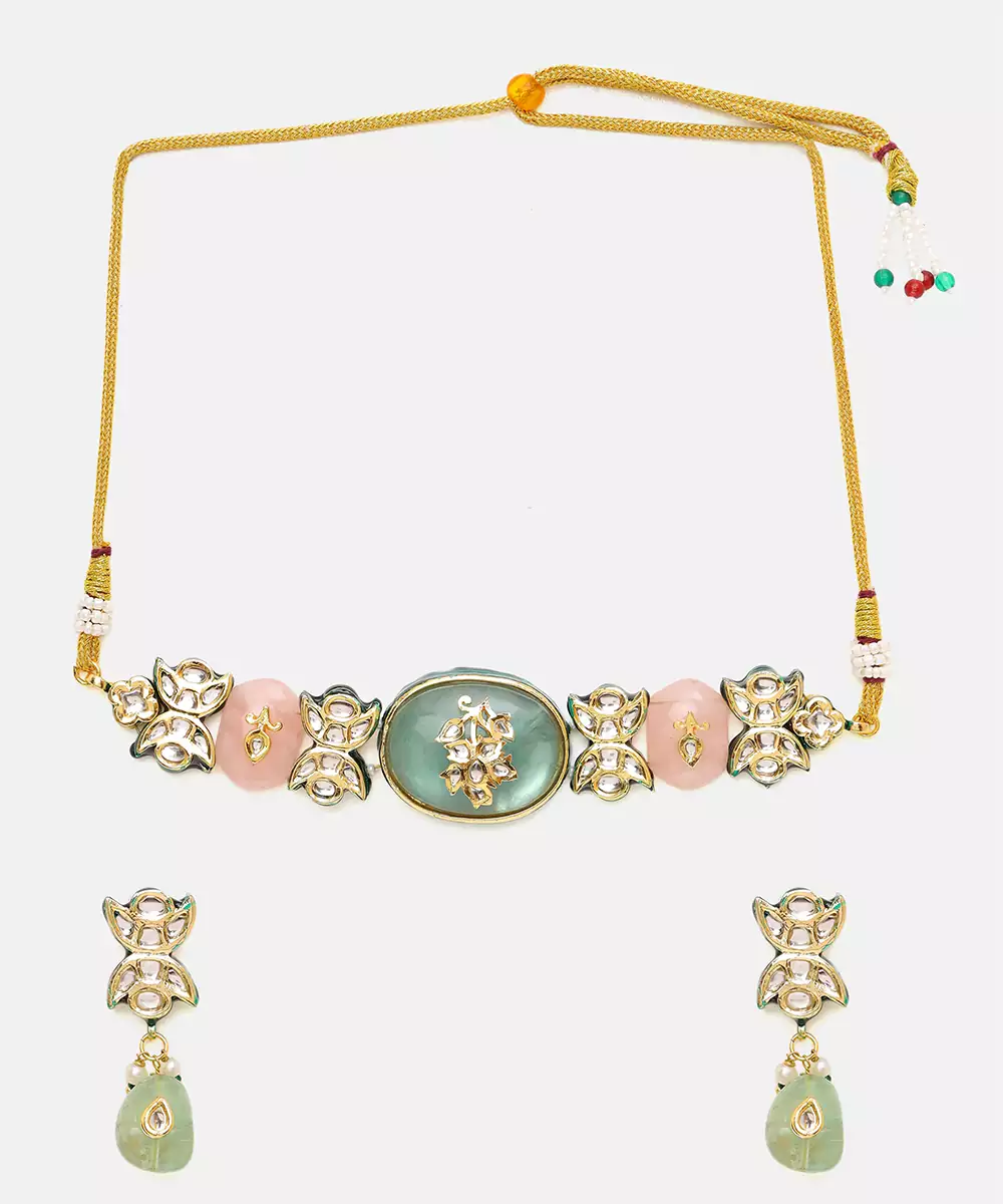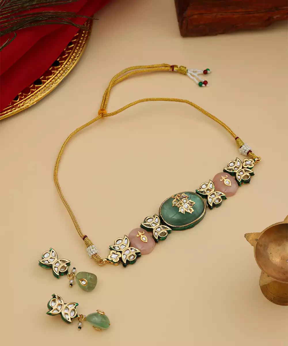 This Gold Plated Kundan Green Stone Choker Necklace Set Radiates Regal Elegance With Its Intricate Craftsmanship And Rich Detailing. Adorned With Classic Kundan Work And Vibrant Green Accents, It Adds A Festive, Traditional Charm. Perfect For Weddings, Celebrations, And Special Occasions, It Beautifully Complements Ethnic And Bridal Ensembles With Timeless Sophistication.