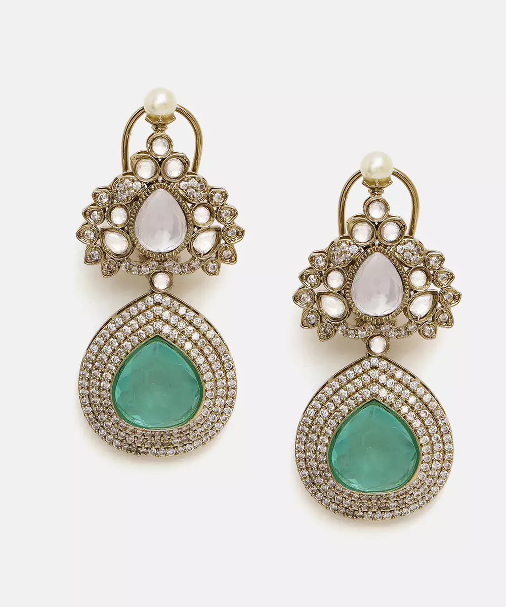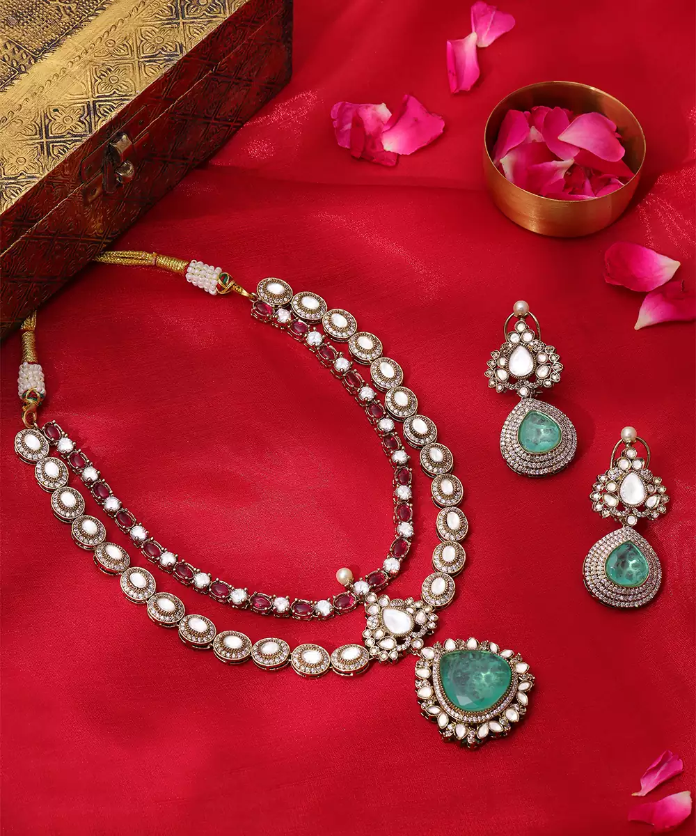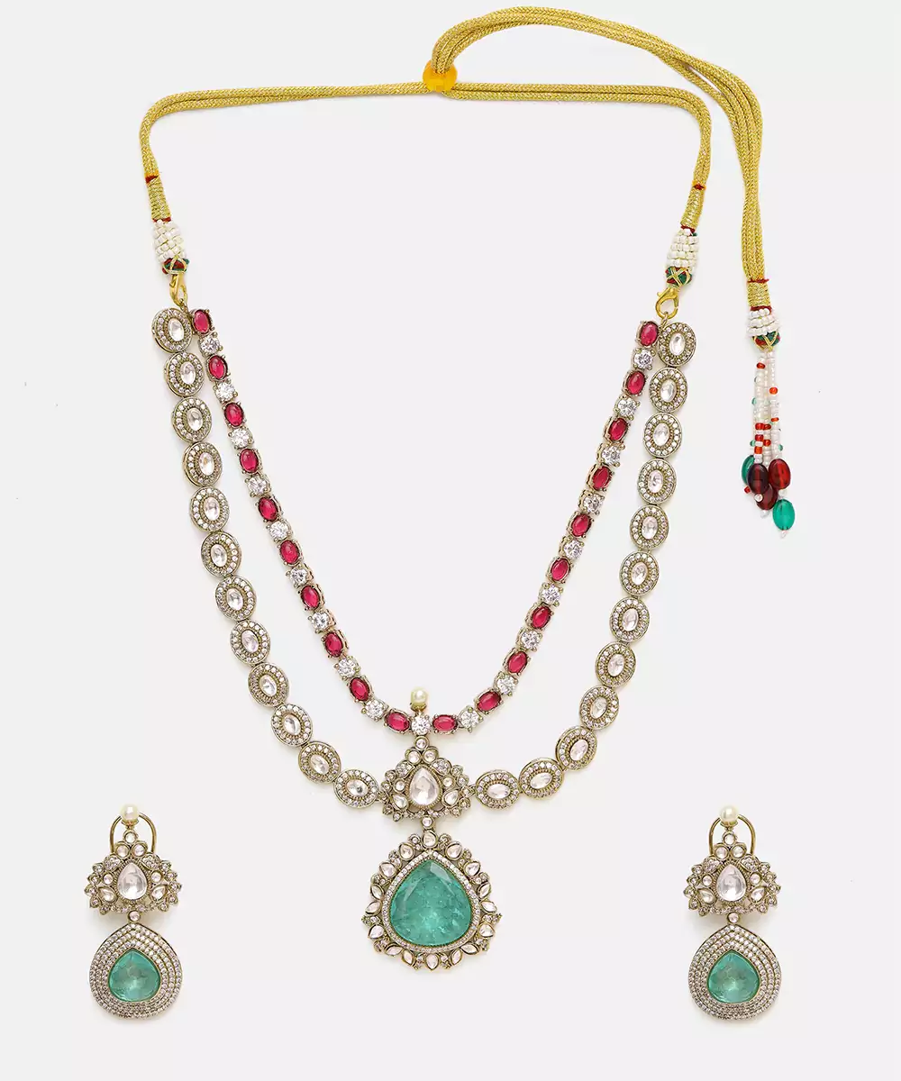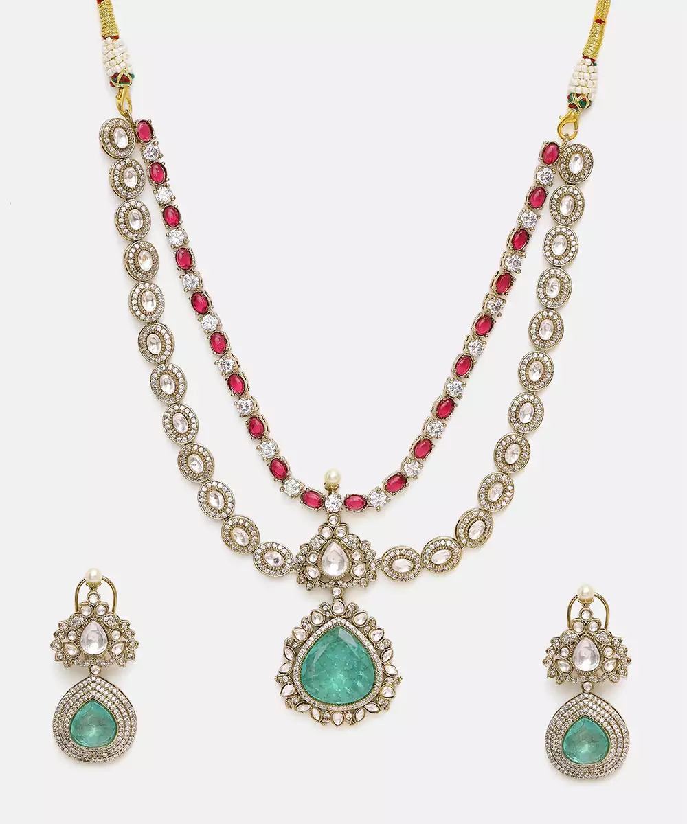 This Gold Plated Kundan Green Stone Necklace Set Radiates Regal Elegance With Its Intricate Craftsmanship And Rich Detailing. Adorned With Classic Kundan Work And Vibrant Green Accents, It Adds A Festive, Traditional Charm. Perfect For Weddings, Celebrations, And Special Occasions, It Beautifully Complements Ethnic And Bridal Ensembles With Timeless Sophistication.