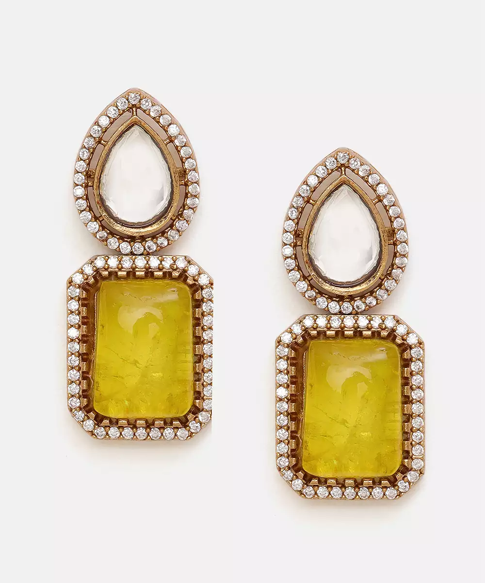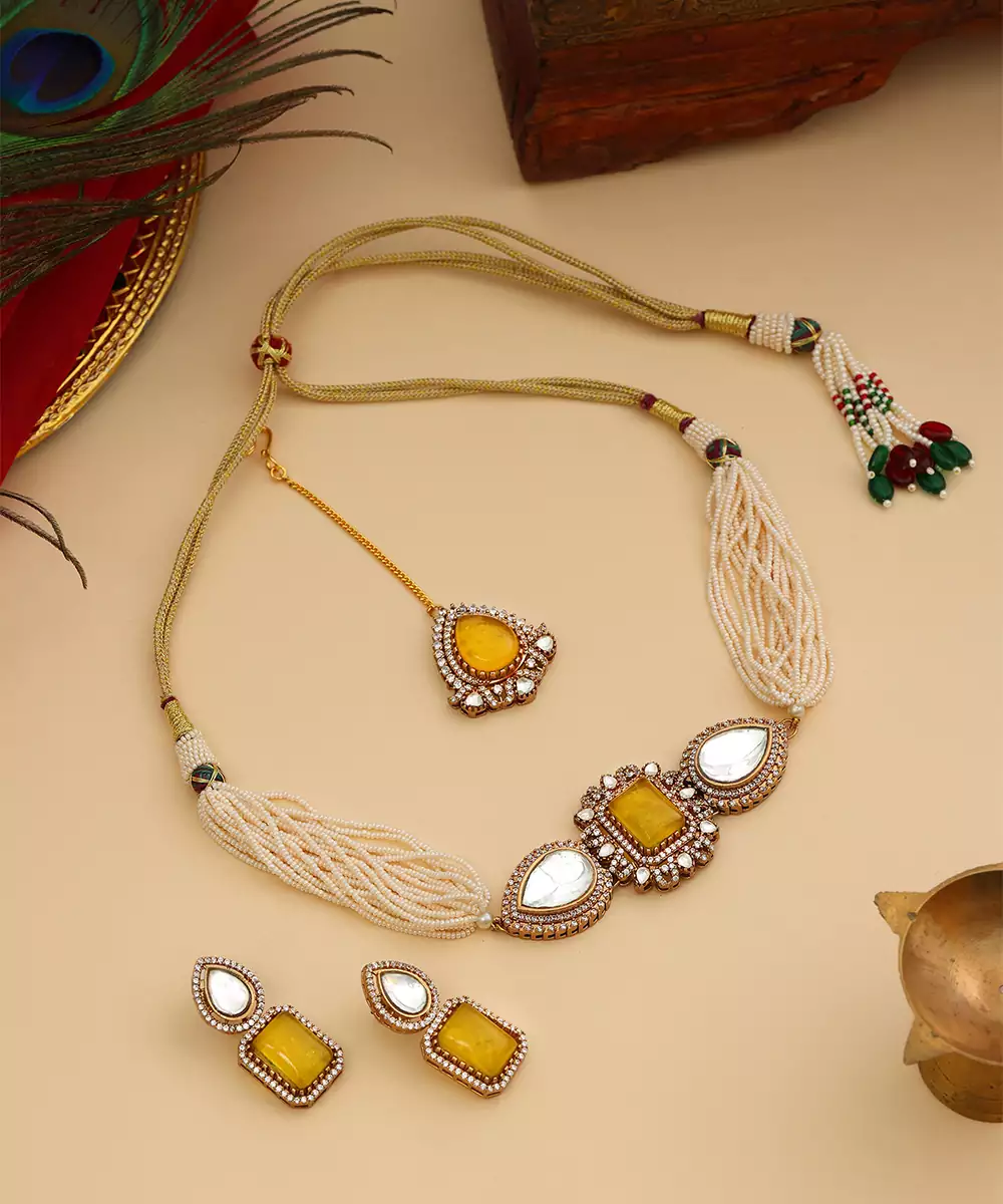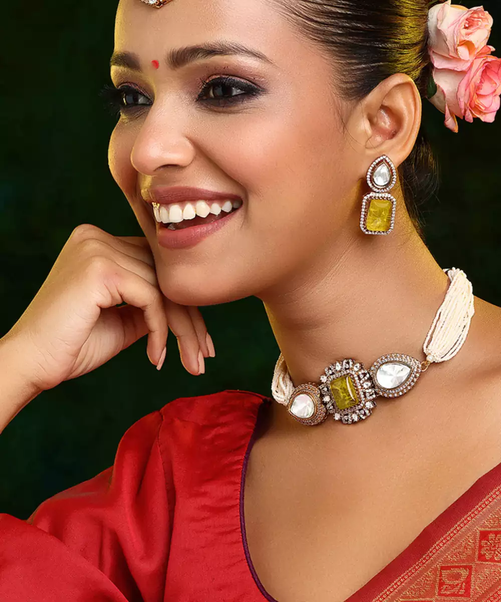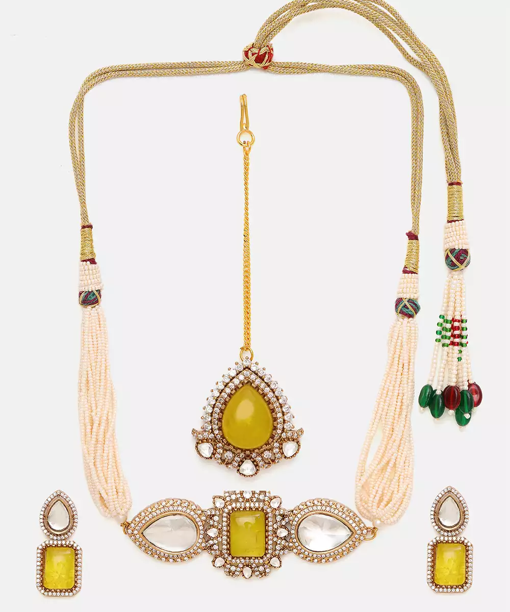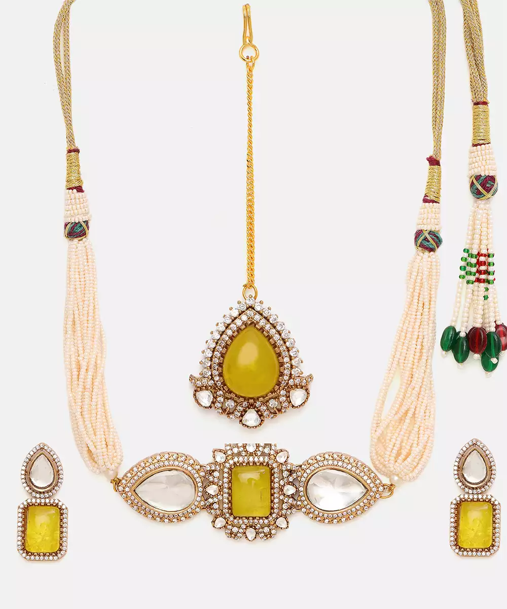 This Y Gold Plated Kundan Yellow Stone Choker Necklace Set Exudes Timeless Elegance With Its Exquisite Craftsmanship And Refined Detailing. Adorned With Classic Kundan Work And Lustrous Pearls, It Adds A Regal, Sophisticated Touch. Perfect For Weddings, Festive Occasions, And Special Celebrations, It Beautifully Complements Traditional And Bridal Ensembles With Graceful Charm.