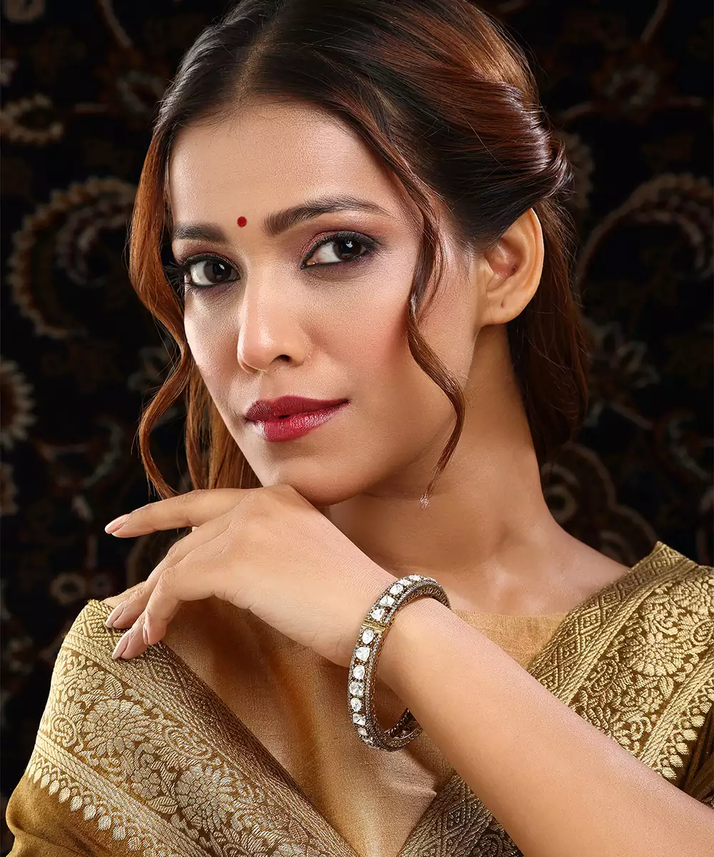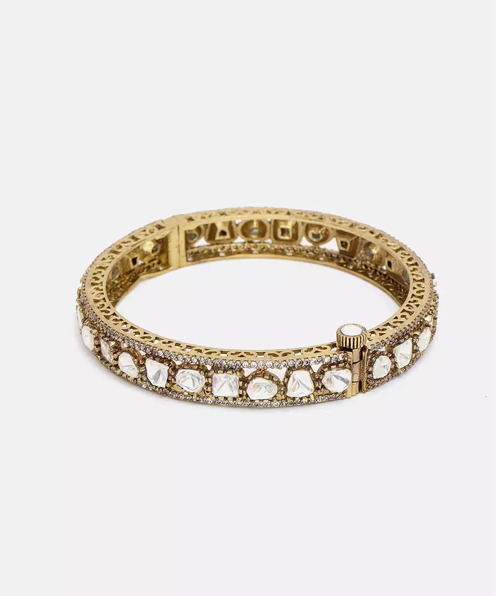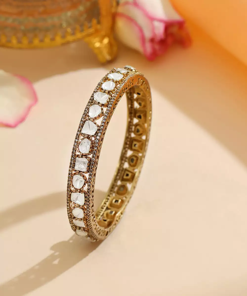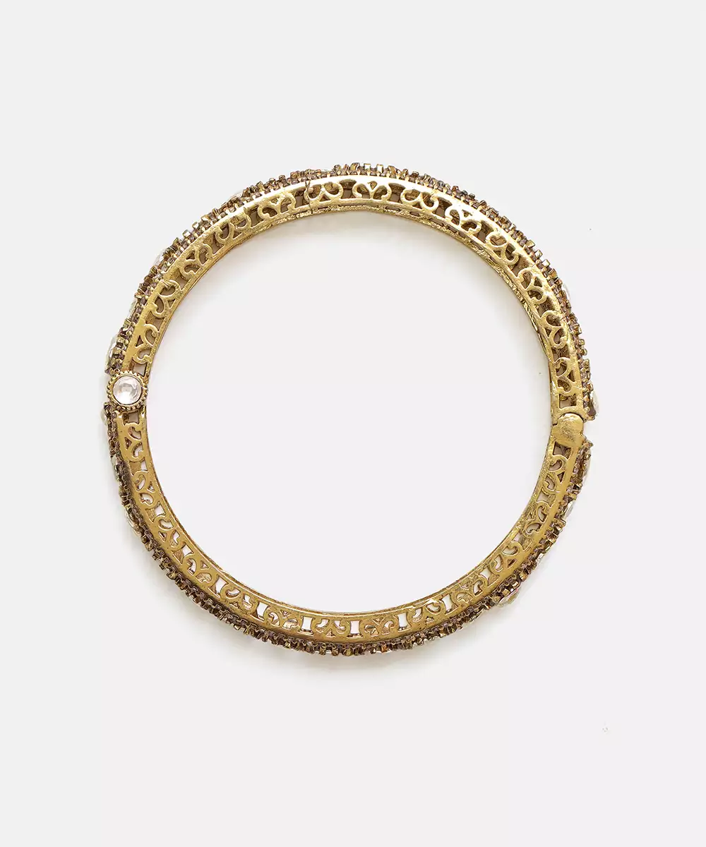 This Gold Kundan Bangle Exudes Timeless Elegance With Its Intricate Craftsmanship And Classic Detailing. Adorned With Shimmering Kundan Work, It Adds A Regal, Festive Touch To Any Ensemble. Perfect For Weddings, Celebrations, And Special Occasions, It Beautifully Complements Traditional And Ethnic Looks With Refined Sophistication.