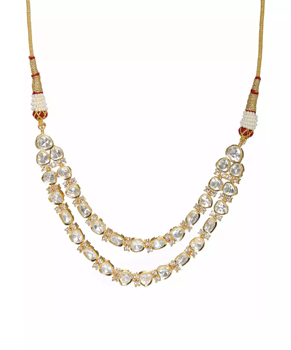 Drape Yourself In Luxury With Our Double Layered Kundan And American Diamond Neckpiece In Pure Brass. Handcrafted By Skilled Women Artisans, This Neckpiece Showcases A Harmonious Interplay Of Kundan And American Diamonds, Creating A Truly Exquisite Accessory