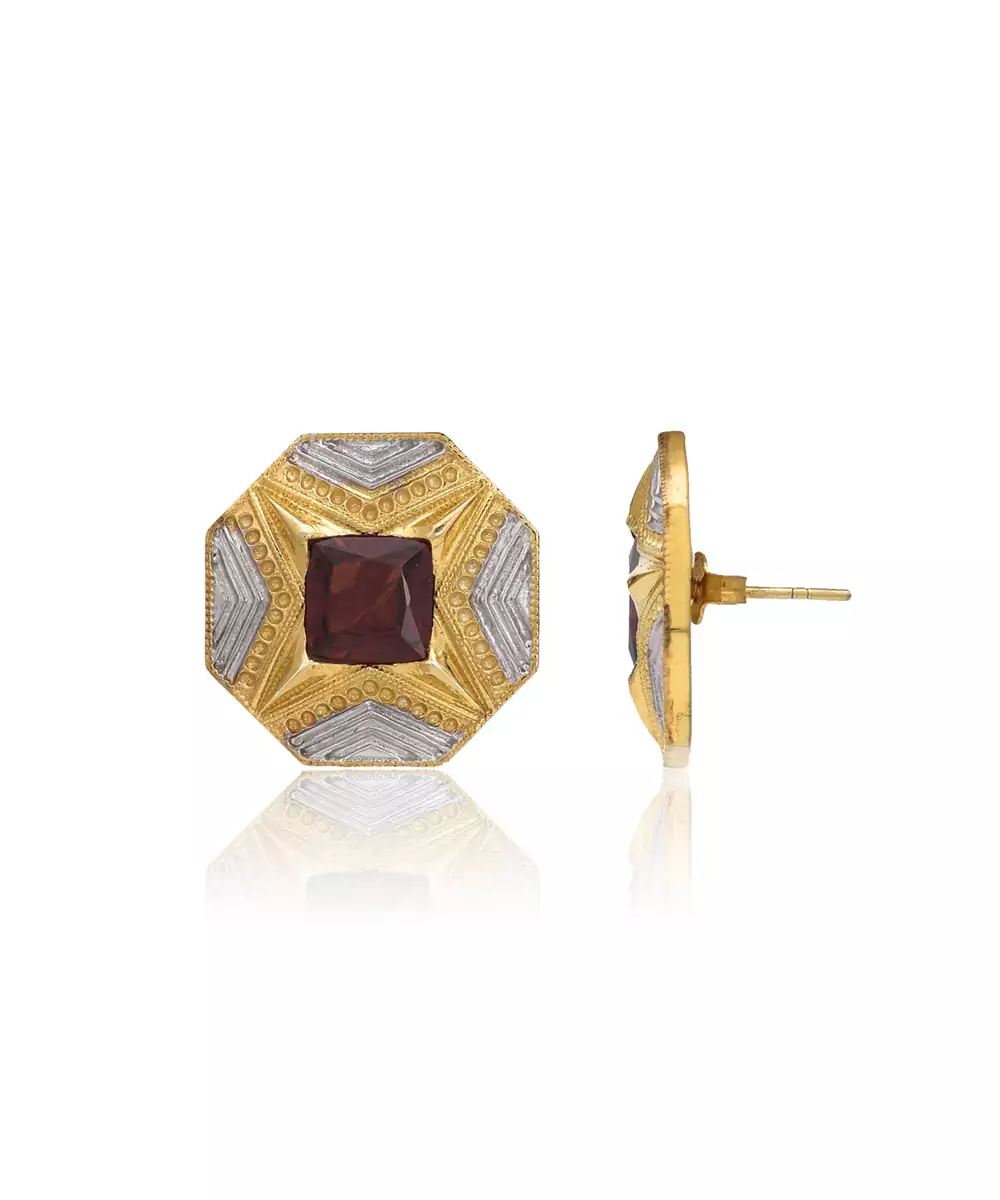 Featuring Statement Ear Studs With Natural Red Garnet And Quality Cubic Zirconia. It Is Crafted In 925 Silver With 18 Kt Gold Plating