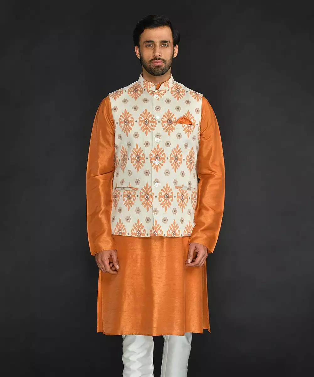Off White Poly. Khadi Textured Printed Bundi With Rust Vis. Silk Kurta Paired With Off White Spun Cotton Chudidar. .
