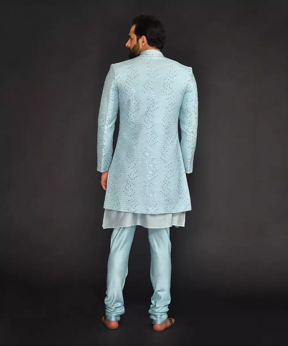 Powder Blue Mirro Textured Embroidery Indo With Vis. Silk Kurta Paired With Vis. Silk Slim Pant .