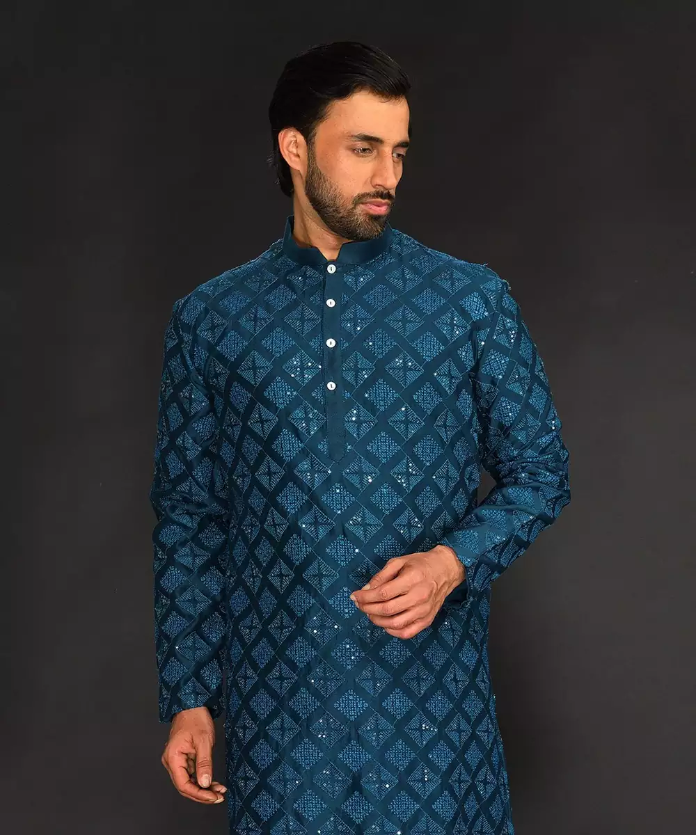 Teal Blue Pure Chanderi Machine Textured Embroidered Kurta Paired With Self Color Vis. Silk Chudidar .