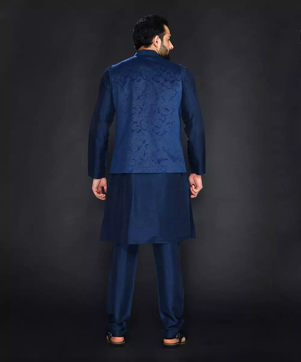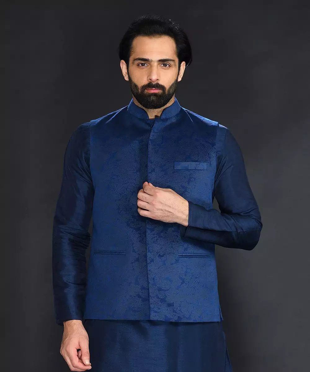 Teal Green Geometric Machine Textured Bundi Paired With Silk Kurta And Chudidar .