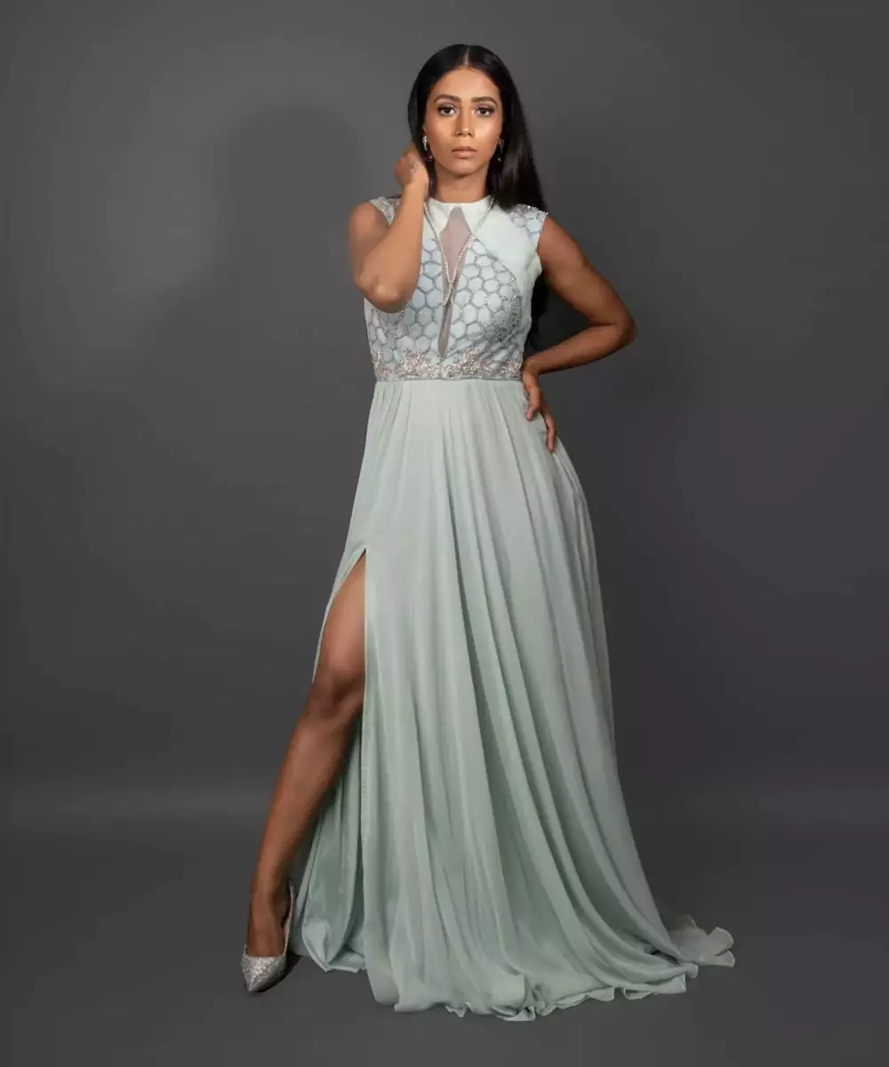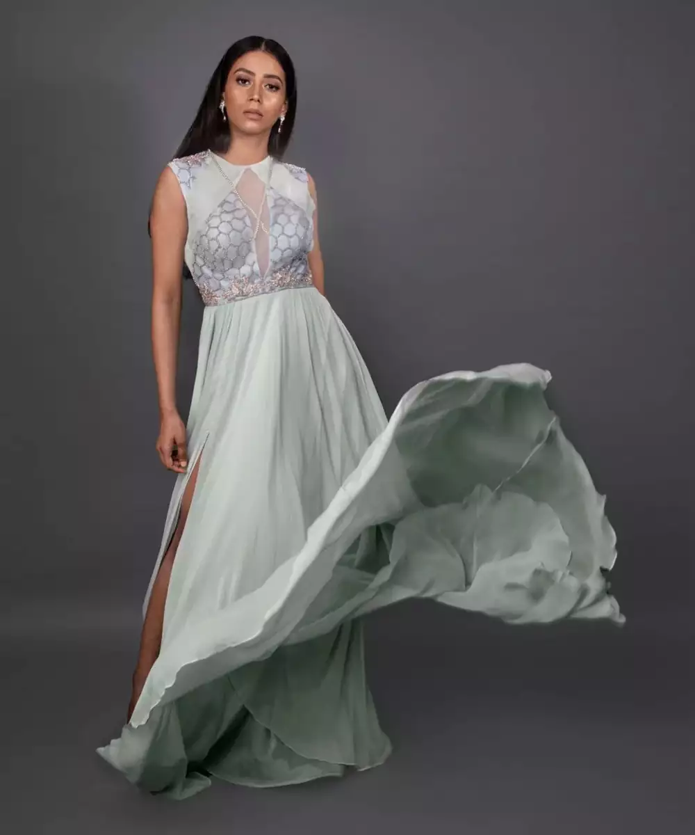 Featuring A Aqua Slit Gown With Honeycomb Hand Embroidery.