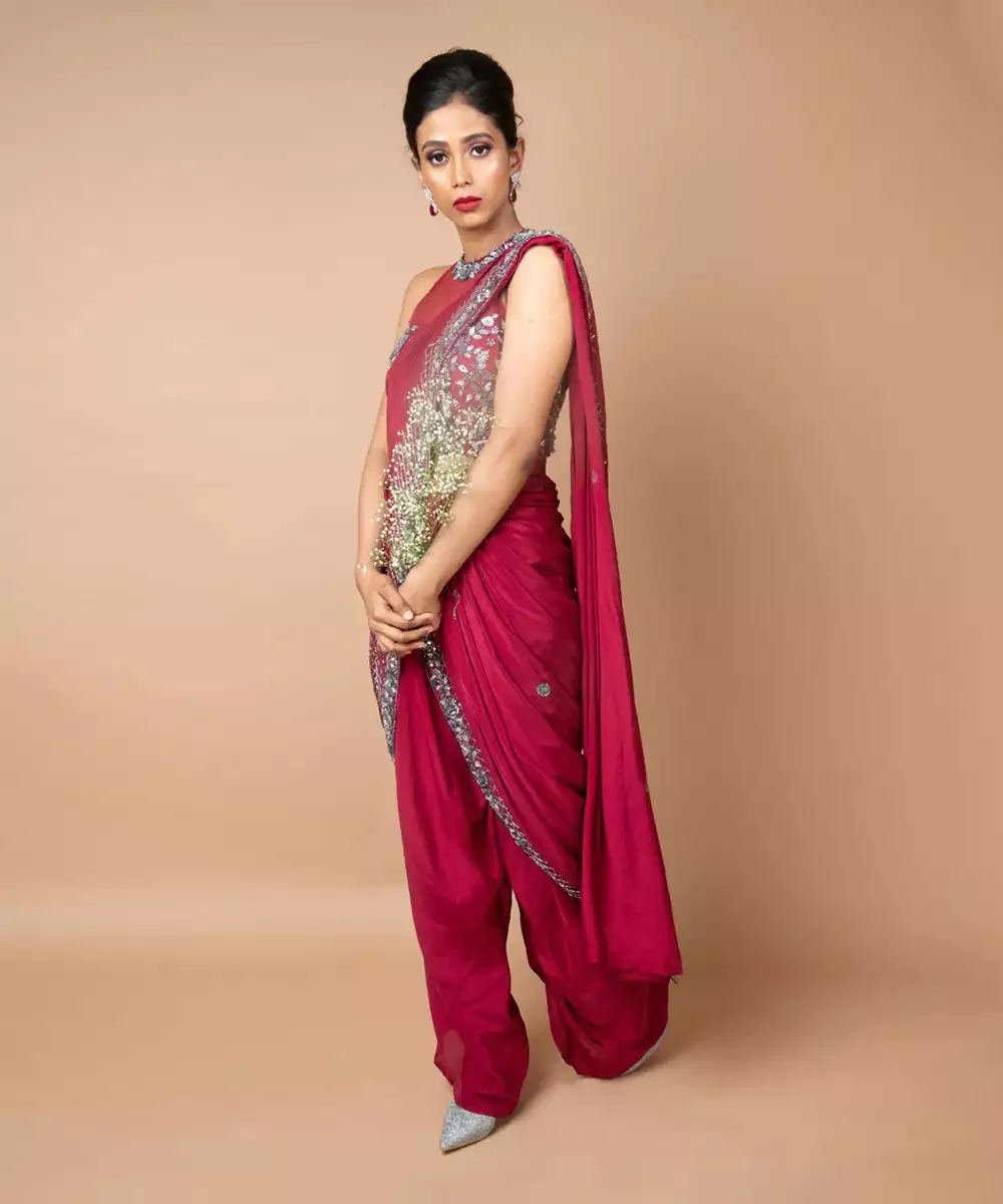 Burgundy Pre Draped Dhoti Saree, With A Hand Embroidered Blouse And Belt. It Is Our Version Of A Fuss Free Fun Saree. Just Zip Up, Cinch With A Belt And Dance Away!
