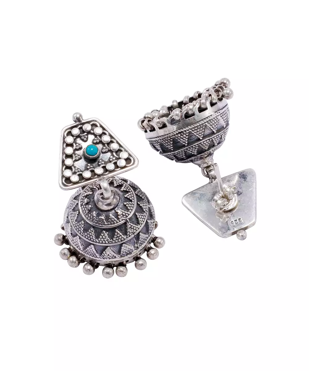 Beautifully Designed Silver Jhumkas With Firoza At The Top Of The Upper Dangle. Add These Lovely Handcrafted Silver Earrings To Your Collection.