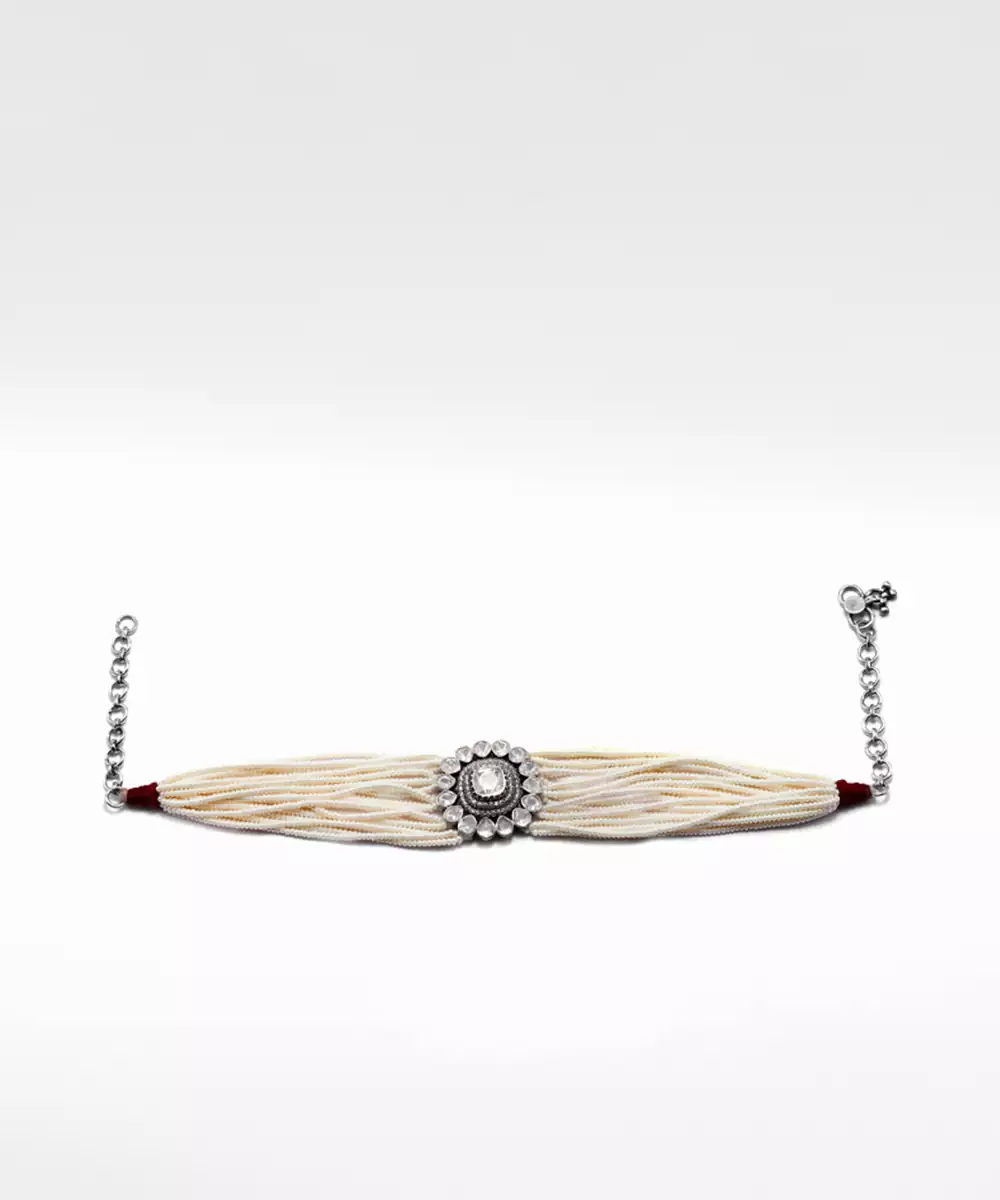 A Beautiful Silver Choker Which Is Crafted With Pearl Beads And Studded With Moissanite Gemstones.
