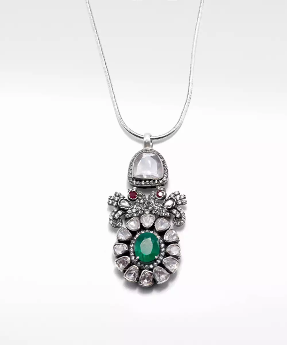 Exude Elegance And Charisma By Wearing This Silver Necklace, Which Is Crafted With Peacock Motifs And Studded With Moissanite Gemstones And Green Onyx.