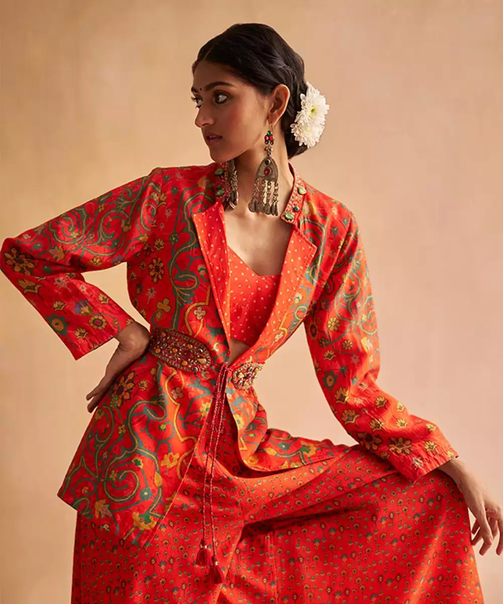 The Bahar Set Features A Printed Blazer, Bustier, And Flared Printed Palazzo Pants With An An Embellished Belt.