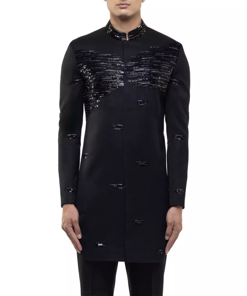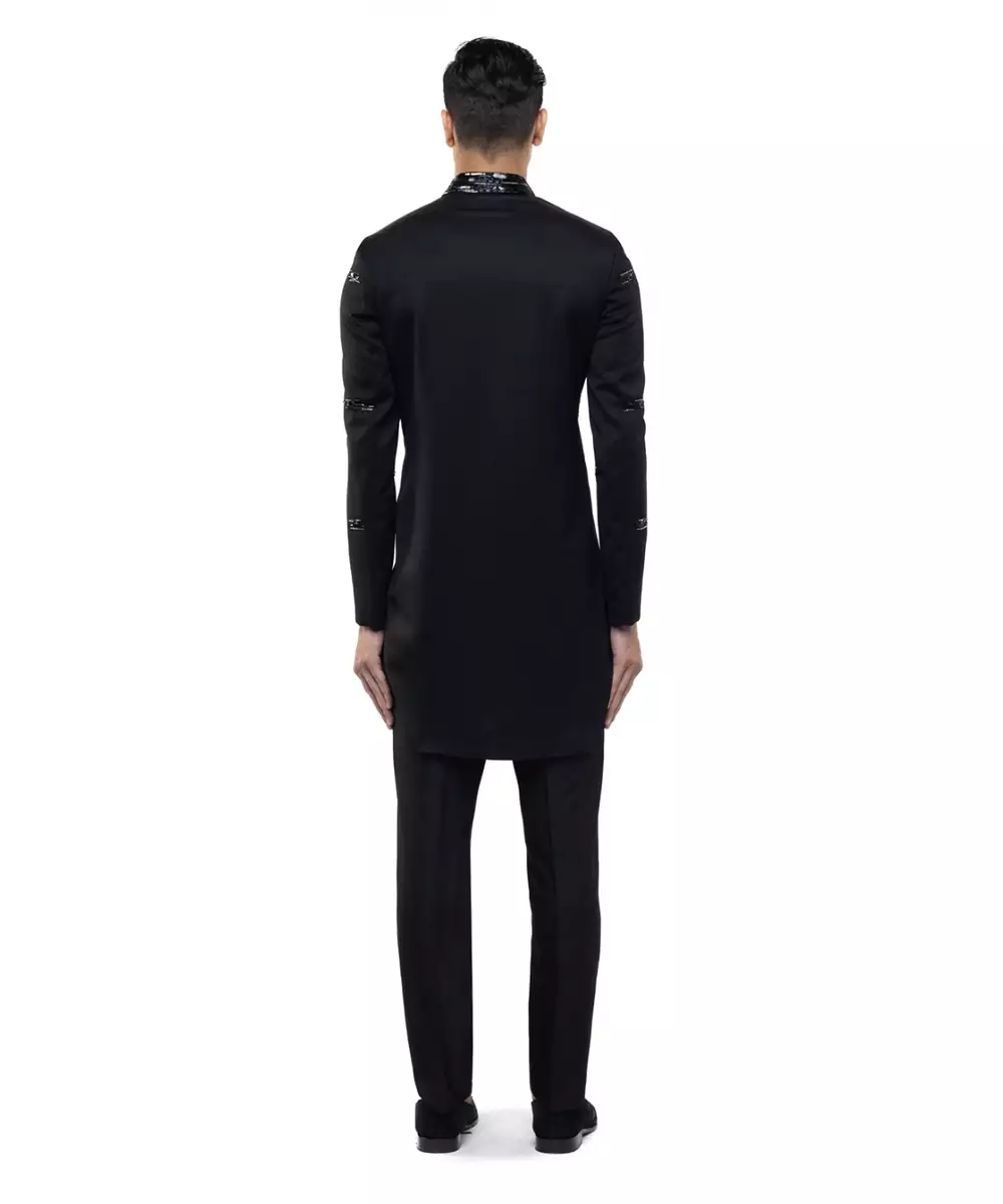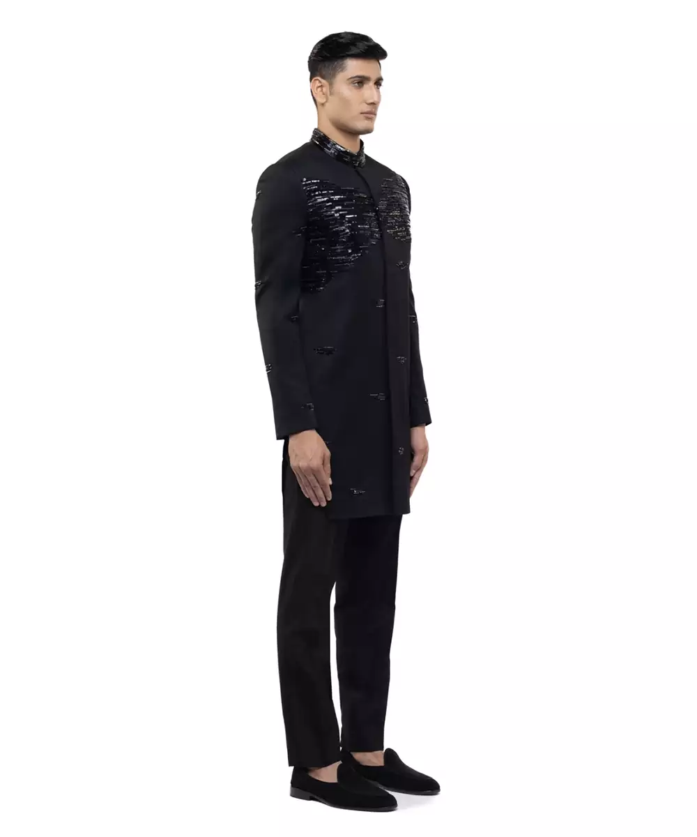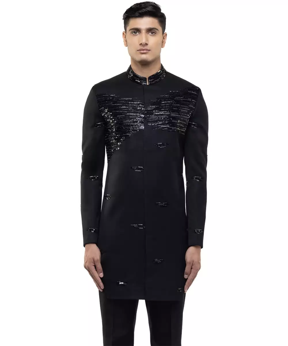 This Black Embroidered Silk Sherwani Set Showcases Regal Elegance And Timeless Craftsmanship. Crafted From Luxurious Silk Fabric, It Features Intricate Embroidery That Adds A Rich, Sophisticated Touch. Ideal For Weddings And Grand Festive Occasions, It Offers A Majestic Silhouette, Premium Comfort, And Classic Ethnic Appeal.