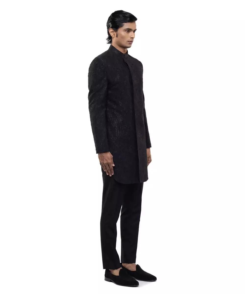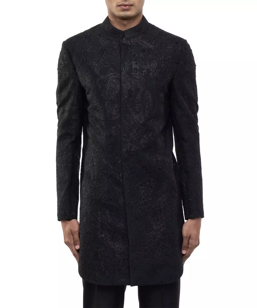 This Black Embroidered Silk Sherwani Set Showcases Regal Elegance And Timeless Craftsmanship. Crafted From Luxurious Silk Fabric, It Features Intricate Embroidery That Adds A Rich, Sophisticated Touch. Ideal For Weddings And Grand Festive Occasions, It Offers A Majestic Silhouette, Premium Comfort, And Classic Ethnic Appeal.