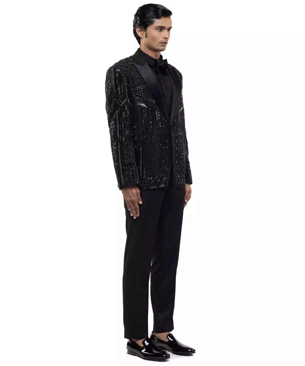 This Black Embroidered Silk Tuxedo Set Exudes Timeless Elegance And Refined Sophistication. Crafted From Luxurious Silk Fabric, It Features Intricate Embroidery That Adds A Rich, Statement Touch. Perfect For Formal Events And Evening Occasions, It Offers A Sharp Silhouette, Premium Comfort, And Classic Formal Appeal.