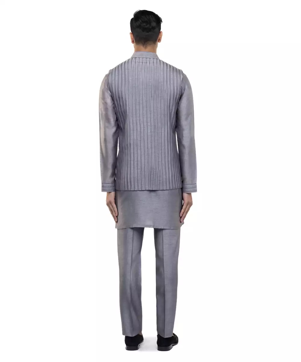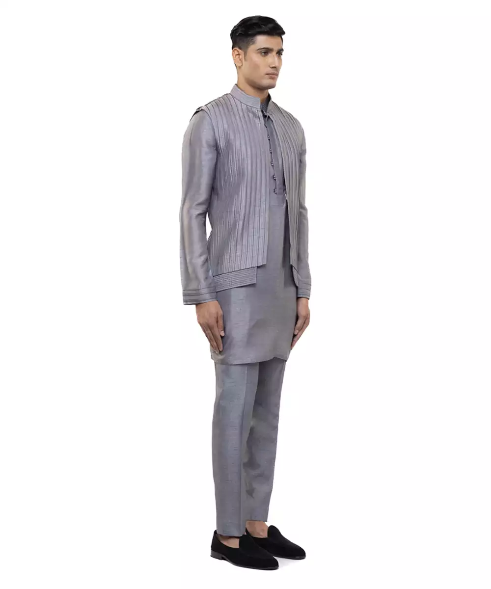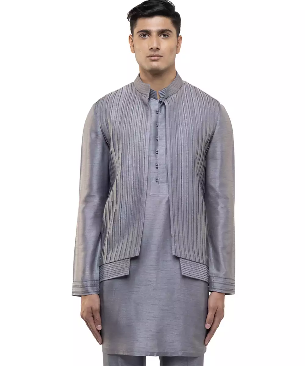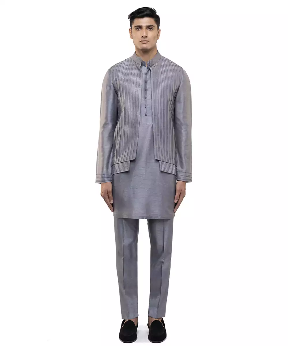 This Grey Plain Silk Kurta Bandi Set Exudes Understated Elegance And Modern Sophistication. Crafted From Luxurious Silk Fabric, It Offers A Smooth, Refined Finish With A Polished Look. Perfect For Festive Occasions And Formal Gatherings, It Provides A Sharp Layered Silhouette, Comfort, And Timeless Ethnic Appeal.