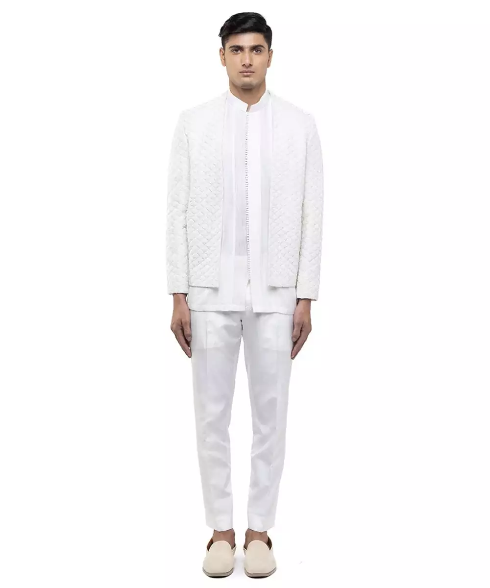 This White Embroidered Silk Bandhgala Set Embodies Timeless Elegance And Royal Sophistication. Crafted From Luxurious Silk Fabric, It Features Intricate Embroidery That Enhances Its Refined Appeal. Perfect For Weddings And Festive Occasions, It Offers A Structured Silhouette, Premium Comfort, And Classic Ethnic Charm.