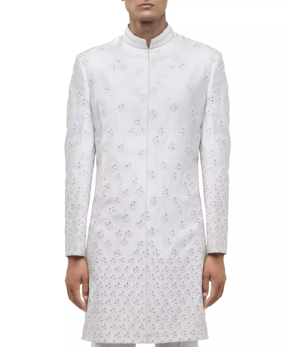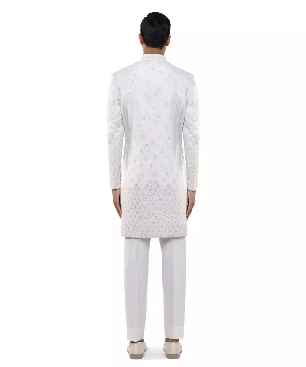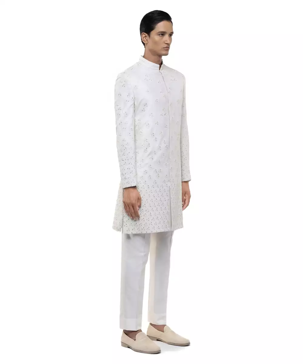 White Embroidered Silk Sherwani Set