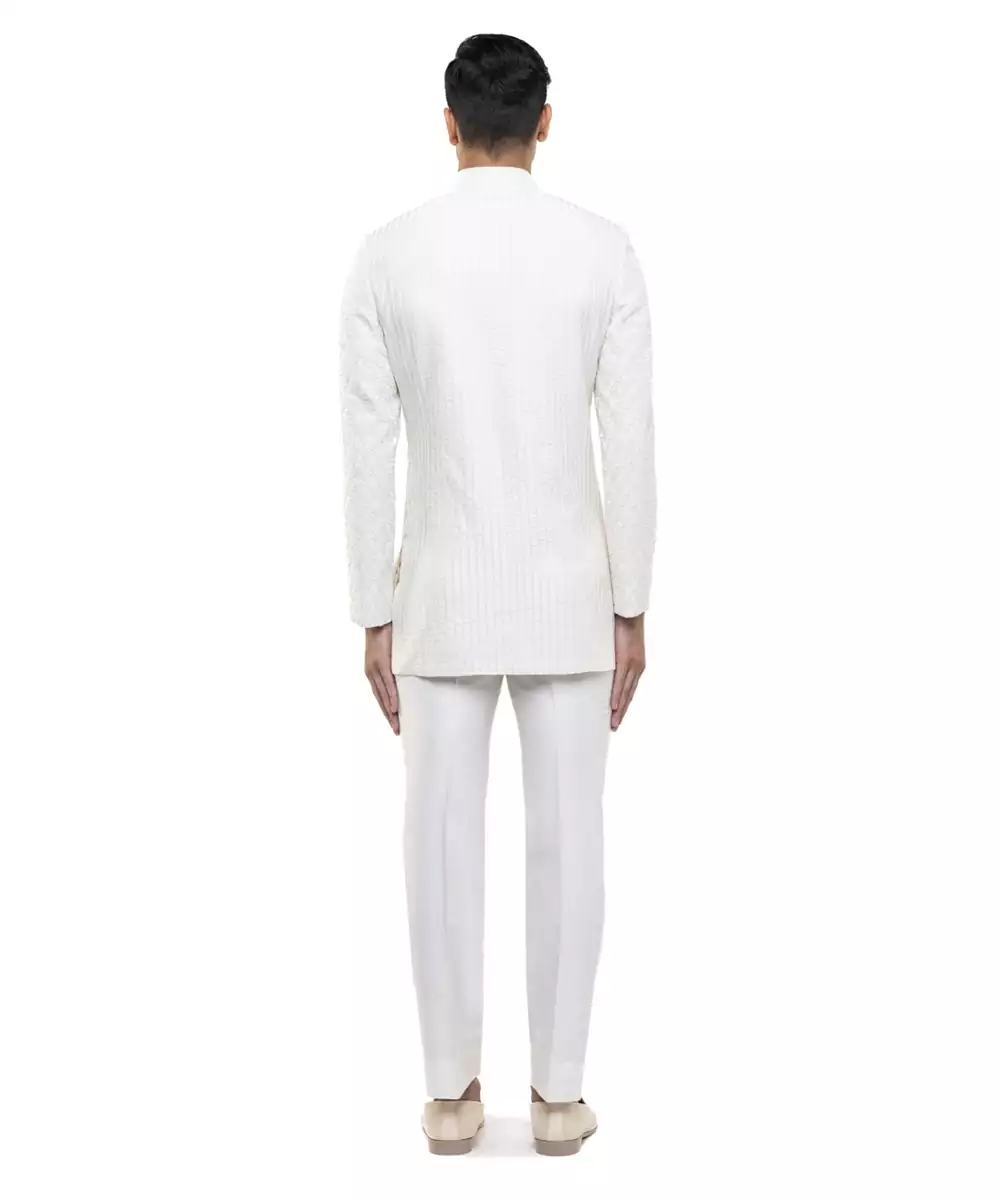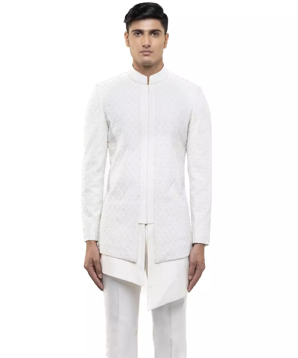 This White Embroidered Silk Sherwani Set Showcases Regal Elegance And Timeless Craftsmanship. Crafted From Luxurious Silk Fabric, It Features Intricate Embroidery That Adds A Rich, Sophisticated Touch. Ideal For Weddings And Grand Festive Occasions, It Offers A Majestic Silhouette, Premium Comfort, And Classic Ethnic Appeal.