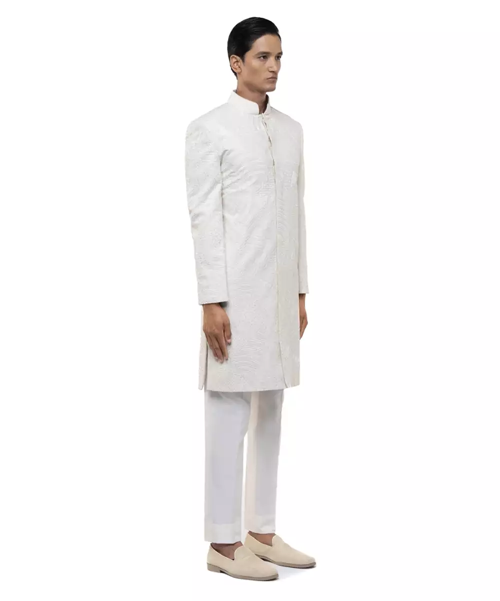 This White Embroidered Silk Sherwani Set Showcases Regal Elegance And Timeless Craftsmanship. Crafted From Luxurious Silk Fabric, It Features Intricate Embroidery That Adds A Rich, Sophisticated Touch. Ideal For Weddings And Grand Festive Occasions, It Offers A Majestic Silhouette, Premium Comfort, And Classic Ethnic Appeal.