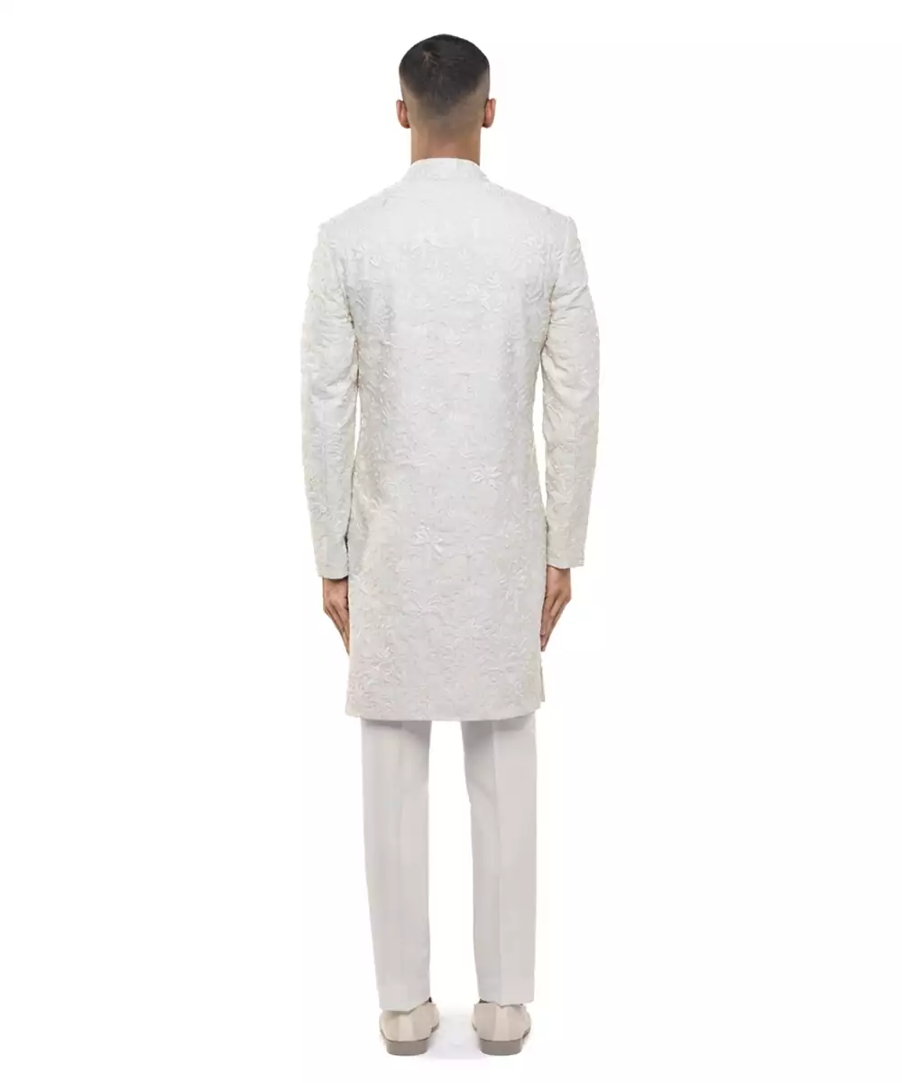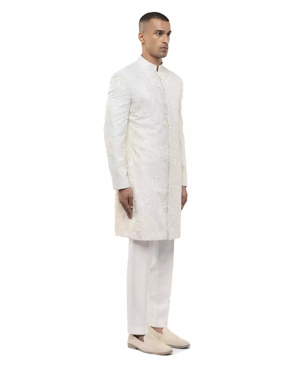 This White Embroidered Silk Sherwani Set Showcases Regal Elegance And Timeless Craftsmanship. Crafted From Luxurious Silk Fabric, It Features Intricate Embroidery That Adds A Rich, Sophisticated Touch. Ideal For Weddings And Grand Festive Occasions, It Offers A Majestic Silhouette, Premium Comfort, And Classic Ethnic Appeal.