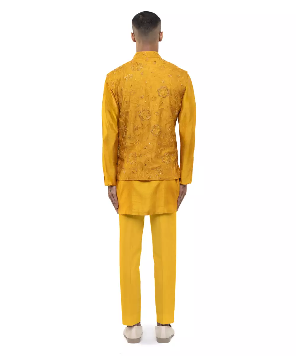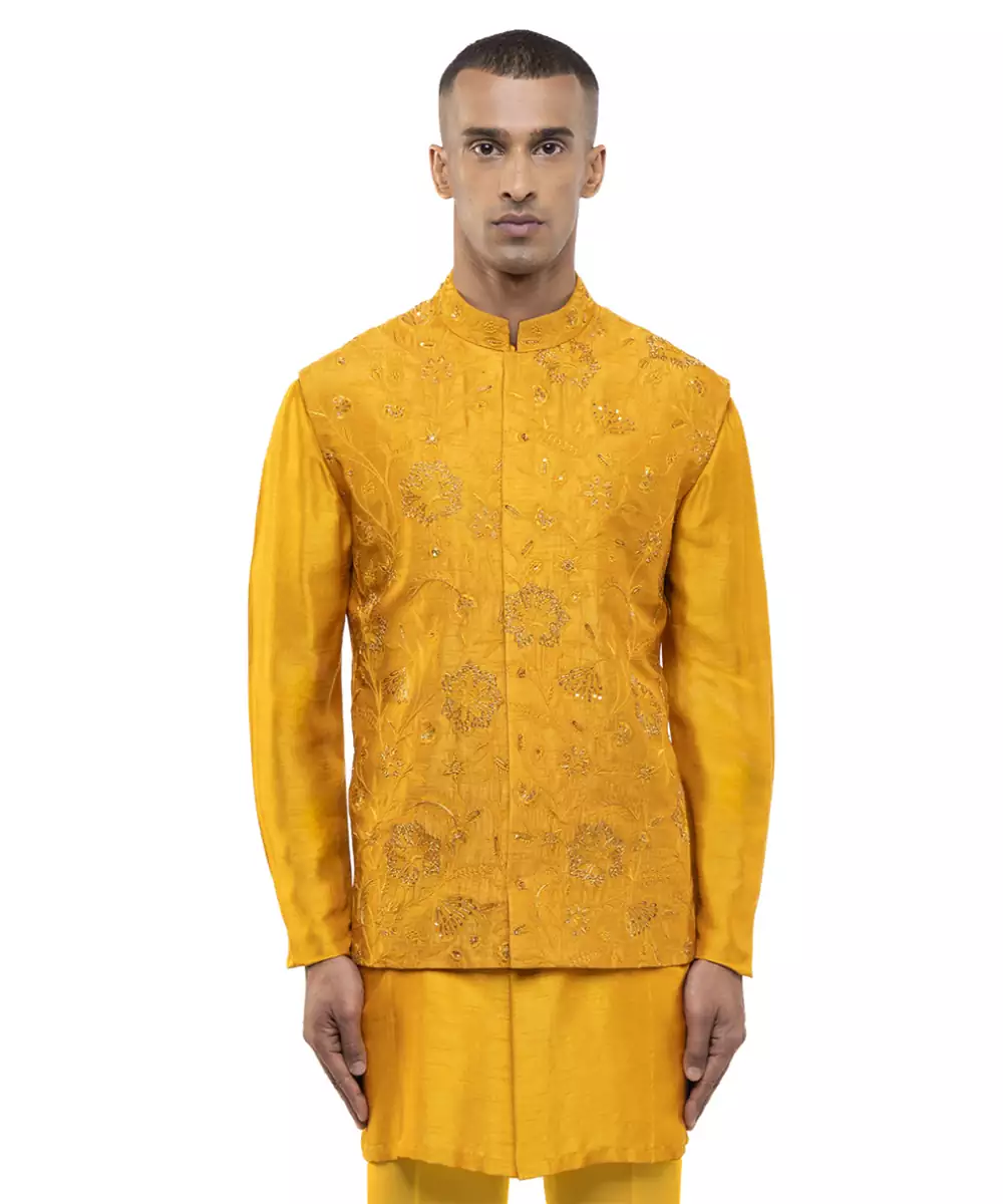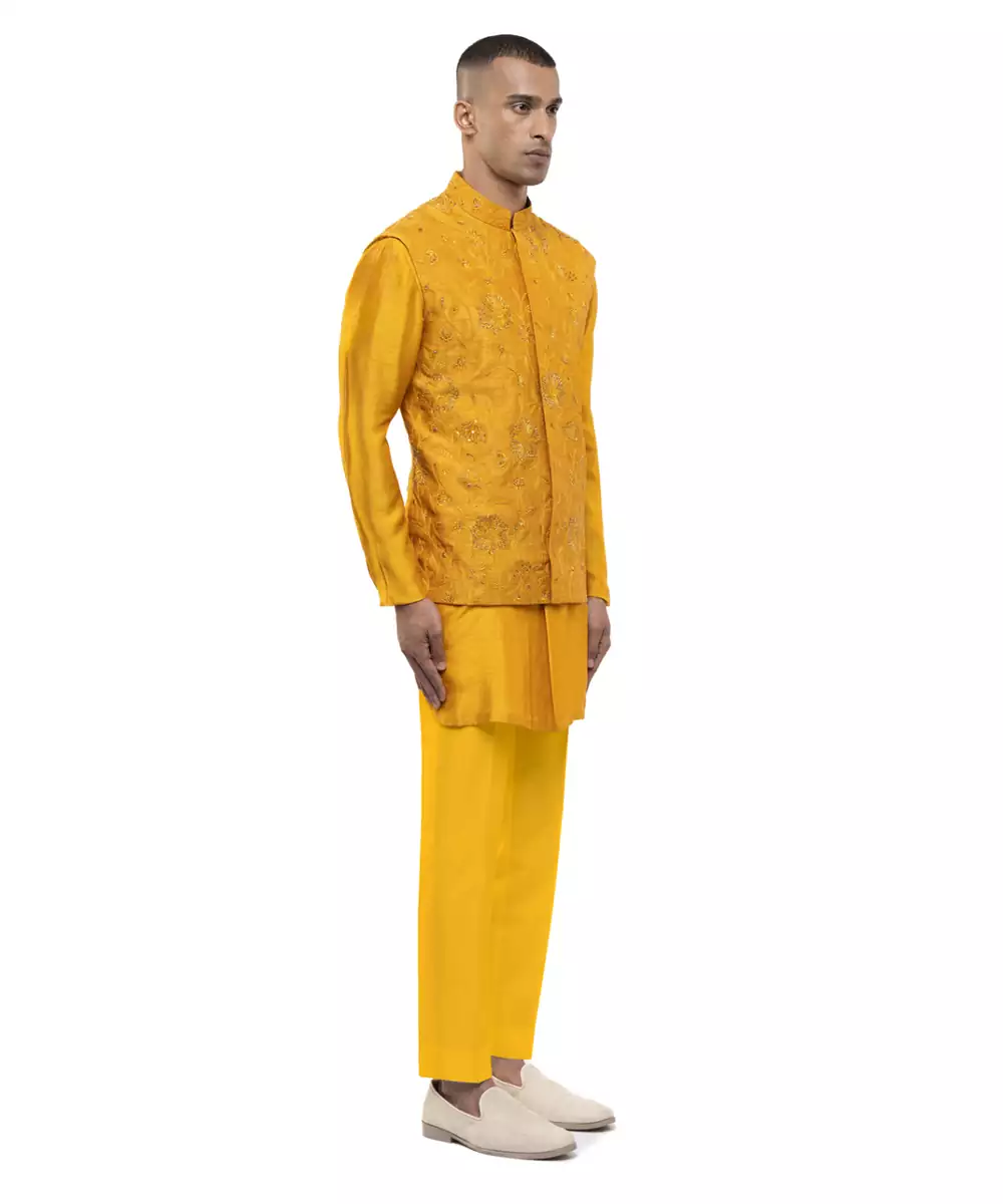 This Yellow Embroidered Georgette Kurta Bandi Set Radiates Festive Elegance And Refined Charm. Crafted From Lightweight Georgette Fabric, It Features Intricate Embroidery That Adds A Rich, Stylish Touch. Perfect For Weddings And Celebrations, It Offers A Sharp Layered Look, Comfortable Fit, And Timeless Ethnic Appeal.