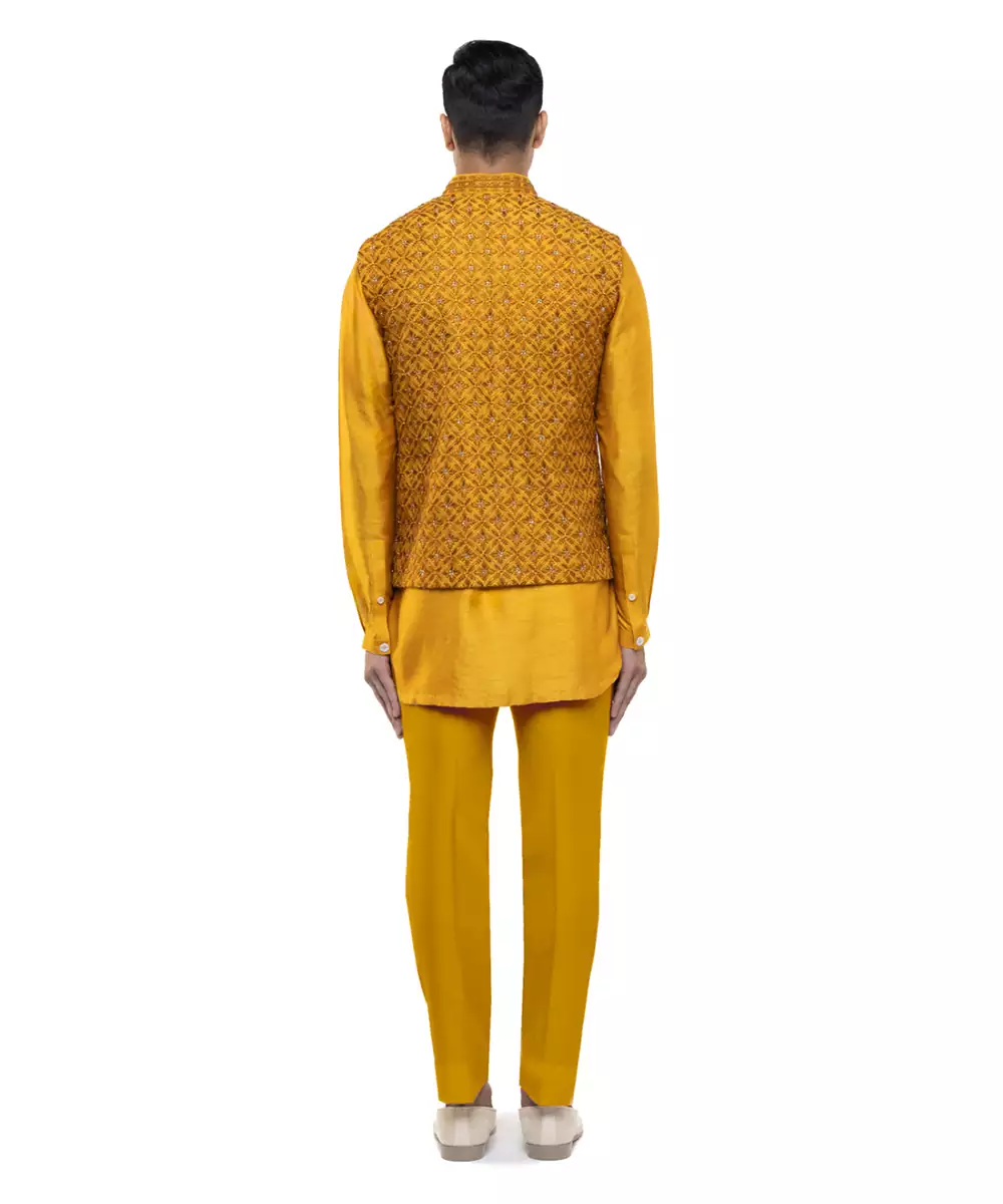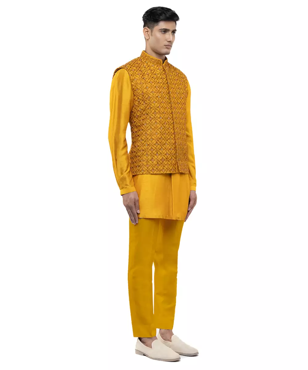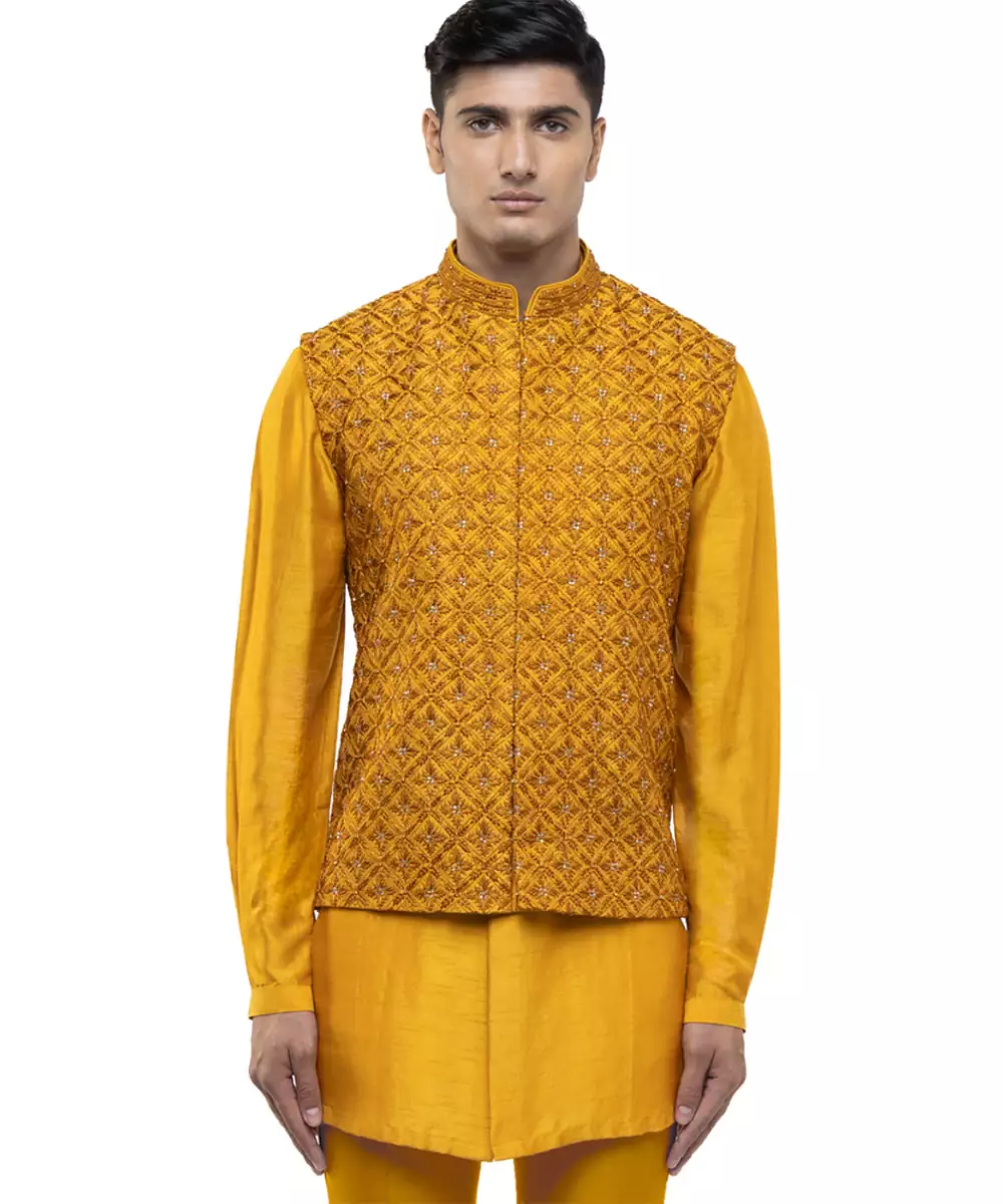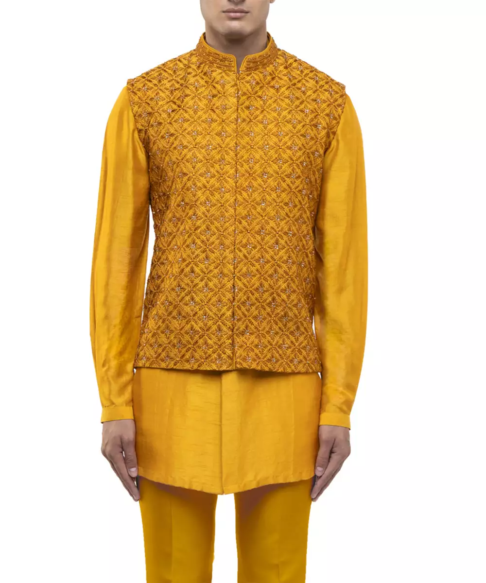 This Yellow Embroidered Silk Kurta Bandi Set Reflects Regal Elegance And Festive Charm. Crafted From Luxurious Silk Fabric, It Features Intricate Embroidery That Adds A Rich, Refined Touch. Perfect For Weddings And Celebrations, It Offers A Sharp Layered Silhouette, Premium Comfort, And Timeless Ethnic Appeal.