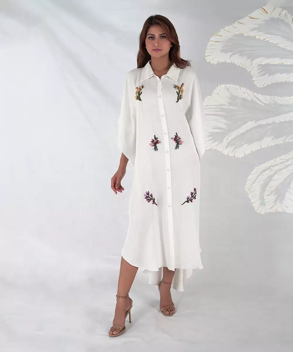 White Collared Kaftan With Hand Painted Applique Embroidery. Colour : White Fabric : Viscose Components : 1 (Kaftan) Work : Printed