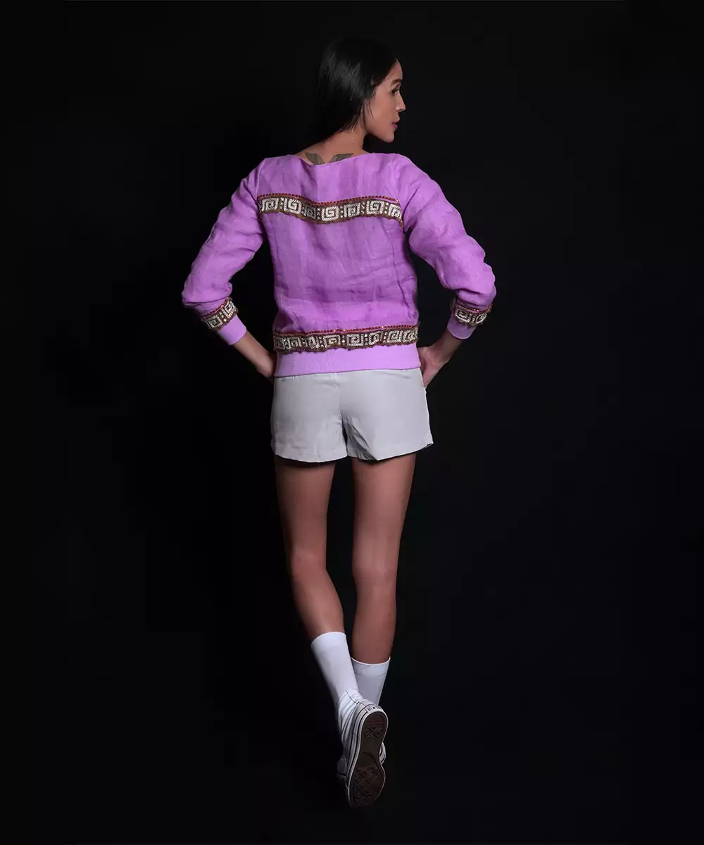 Purple Rose Top With Geometric Embroidery On Light Linen Colour : Purple