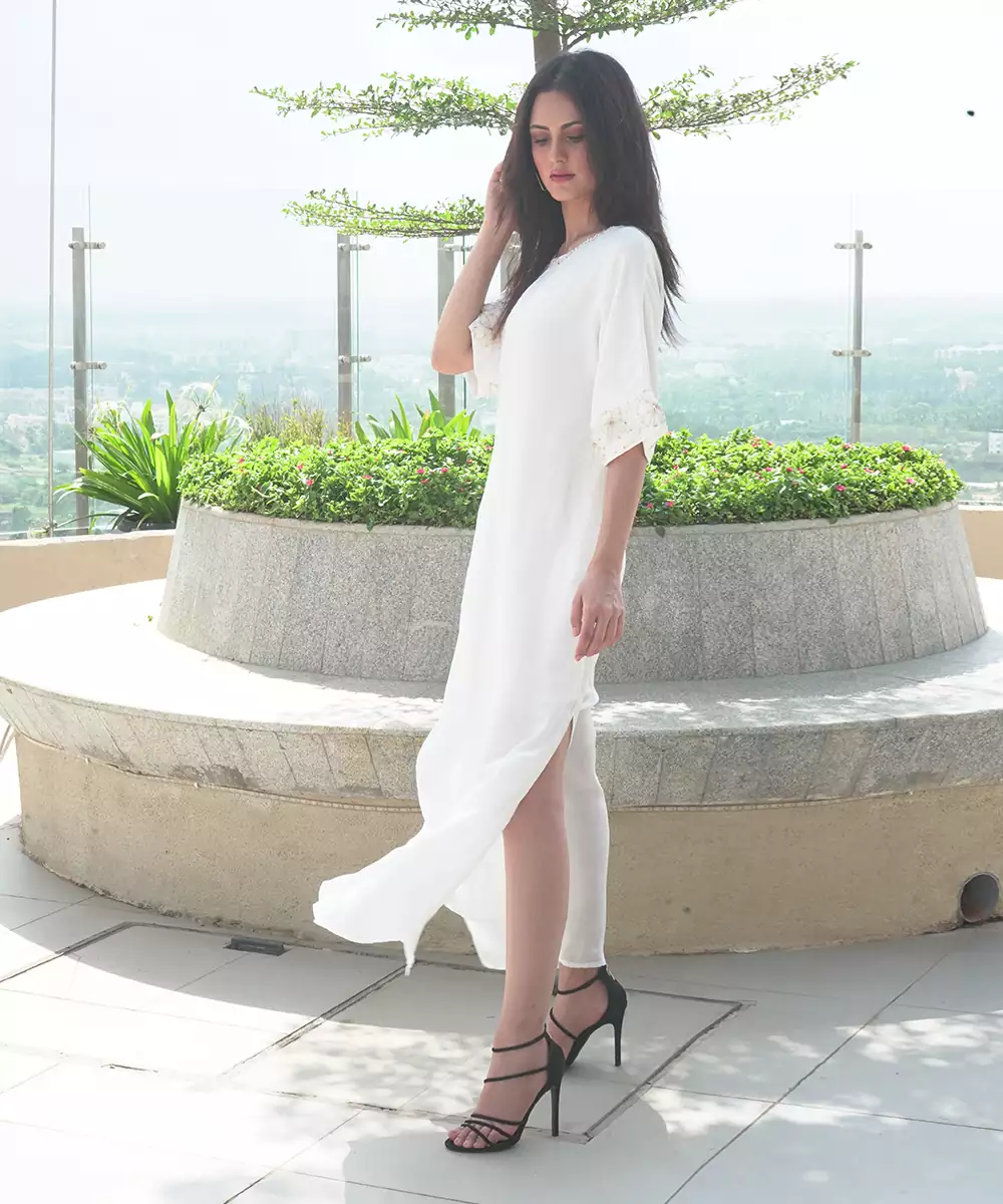 White Viscose Kaftan With Floral Embroidery On Sleeves Colour : White