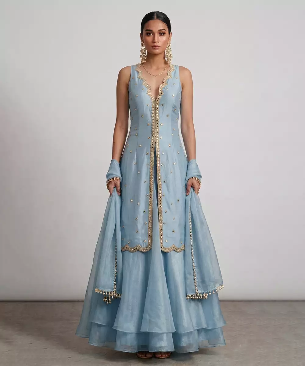 This Aqua Blue Organza Sharara Set Features Intricate Embroidery That Enhances Its Fresh And Soothing Appeal. The Sheer, Lightweight Fabric Drapes Beautifully, Creating A Graceful Silhouette. Perfect For Festive Occasions Or Daytime Events, It Pairs Effortlessly With Minimal Accessories For A Chic And Elegant Look.