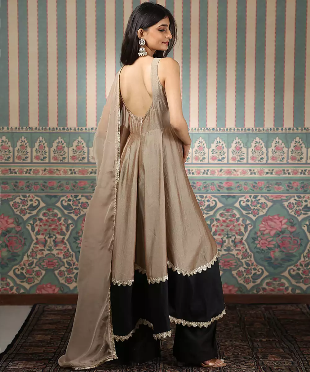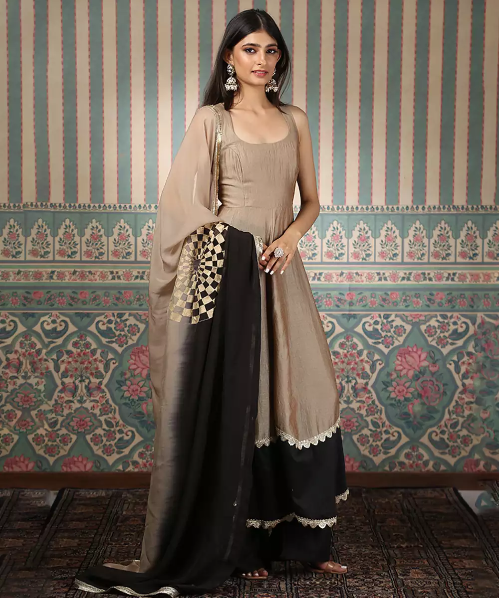This Beige And Green Embroidered Silk Blend Anarkali Set Embodies Timeless Elegance And Regal Charm. Crafted From A Luxurious Silk Blend Fabric, It Features Intricate Embroidery That Adds A Rich, Refined Touch. Perfect For Festive Occasions And Weddings, It Offers A Flowing Silhouette, Premium Comfort, And Classic Ethnic Appeal.