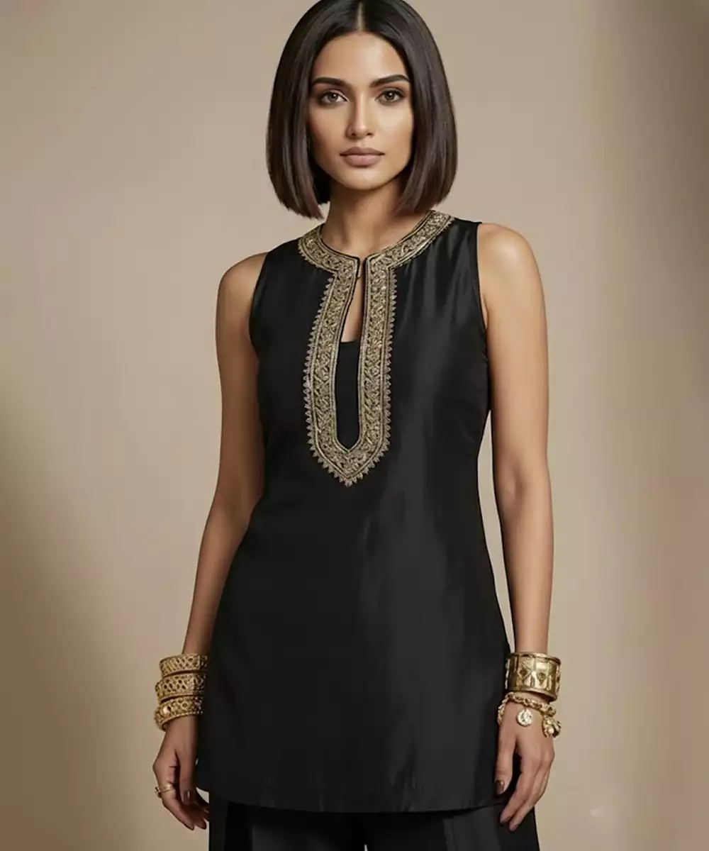 A Bold Black Co Ord Set Crafted In Luxurious Raw Silk And Accented With Intricate Embroidery For A Striking Ethnic Look. The Subtle Sheen Of The Fabric Adds Depth, While The Coordinated Silhouette Offers Comfort And Style. Perfect For Festive Evenings, Parties, And Special Occasions.