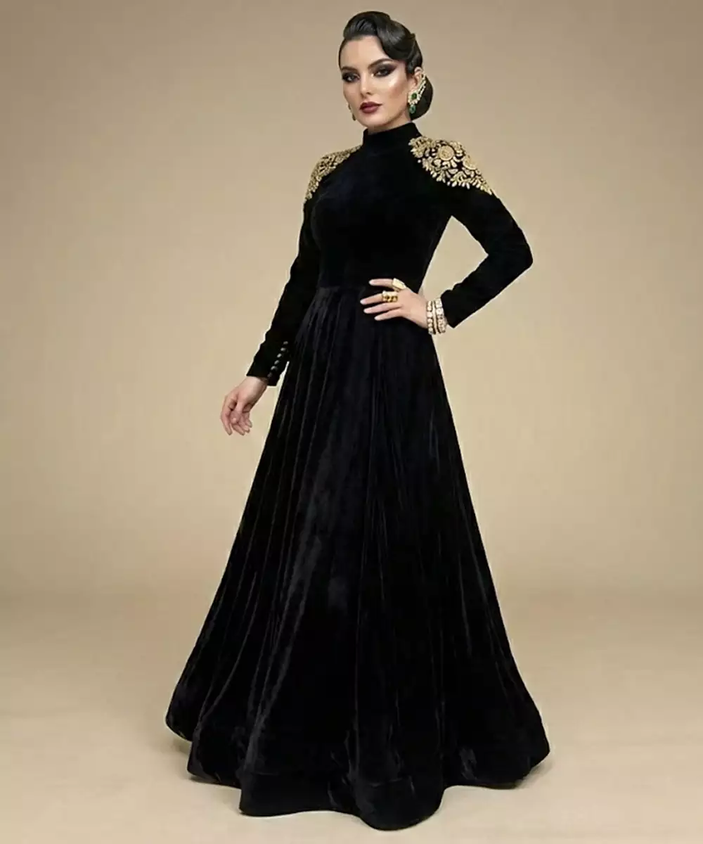 Opulent And Striking, This Black Velvet Gown Features Intricate Embroidery That Adds Royal Character. The Rich Texture Enhances Its Evening Appeal, While The Flowing Silhouette Creates Effortless Elegance. Perfect For Receptions, Festive Nights, Or Formal Occasions, This Gown Is Designed To Make A Bold, Graceful Statement.