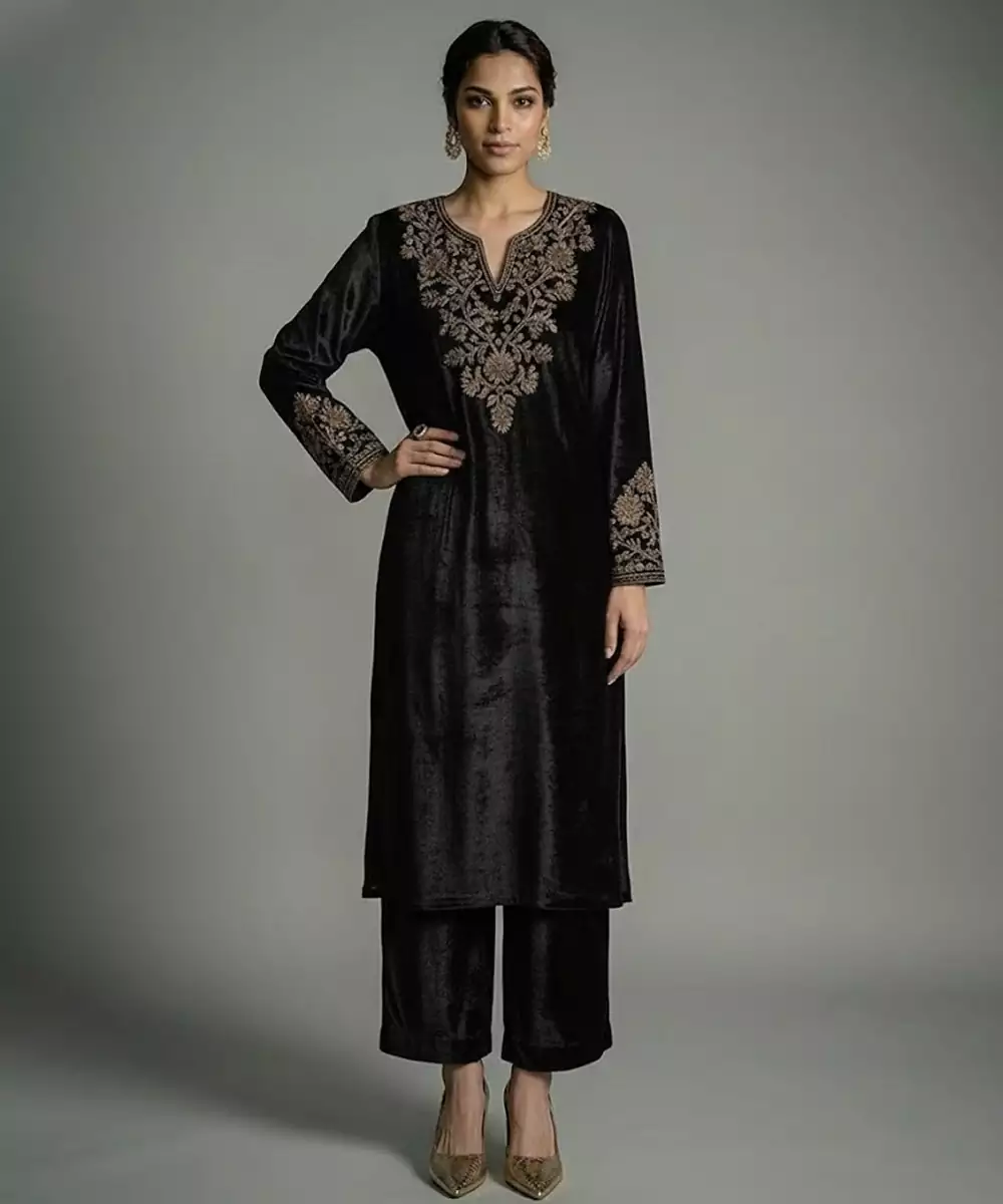 Rich Black Velvet Meets Detailed Embroidery In This Luxurious Kurta Set. The Plush Texture Adds Warmth And Grandeur, While The Elegant Silhouette Keeps It Timeless. Ideal For Winter Festivities, Evening Events, Or Wedding Functions, This Outfit Delivers Drama, Comfort, And Classic Ethnic Sophistication.