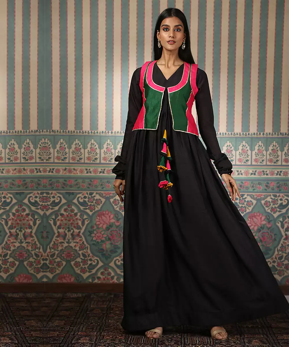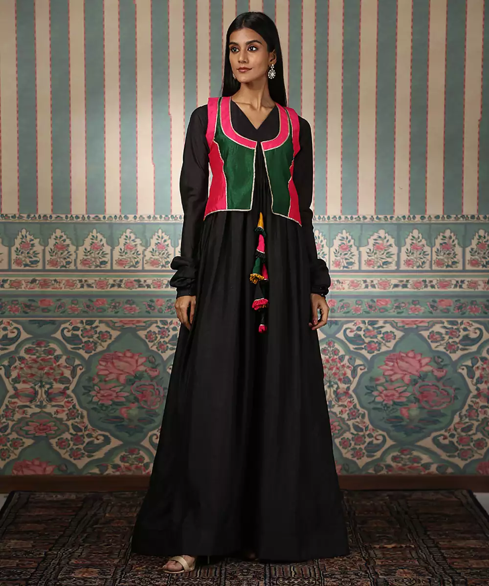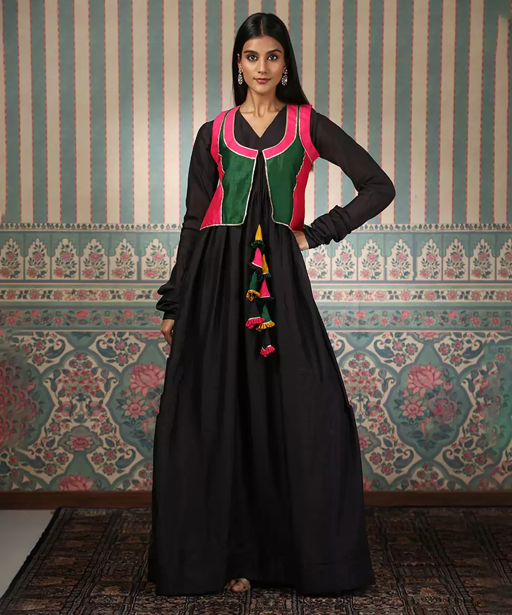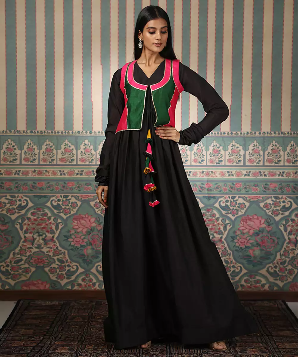 This Black Plain Silk Blend Gown Exudes Timeless Elegance And Effortless Sophistication. Crafted From A Smooth, Luxurious Silk Blend Fabric, It Offers A Graceful Drape And Refined Finish. Perfect For Evening Events And Special Occasions, It Delivers A Flattering Silhouette, Premium Comfort, And Classic Style.