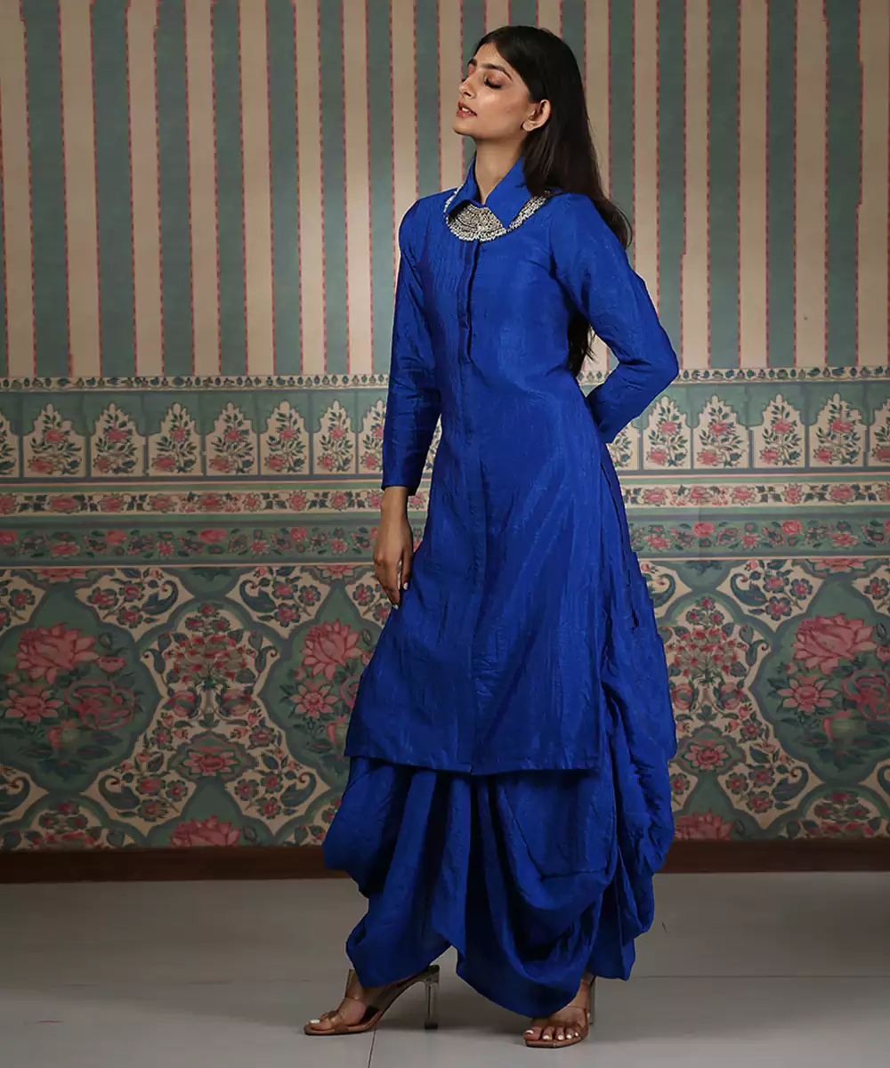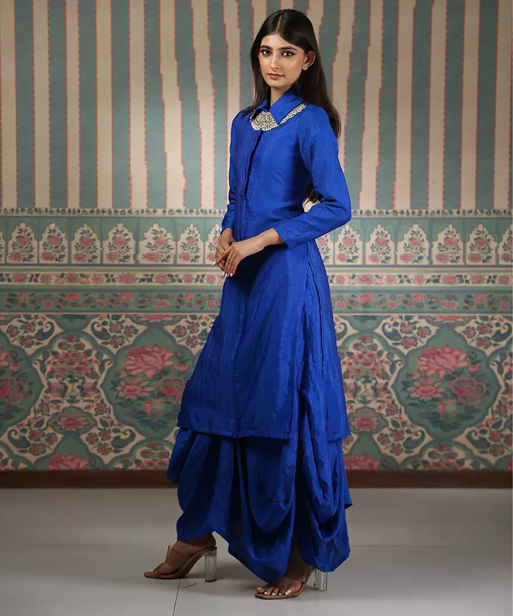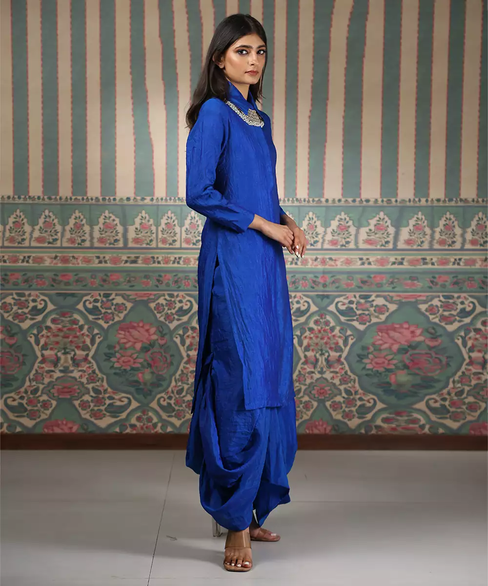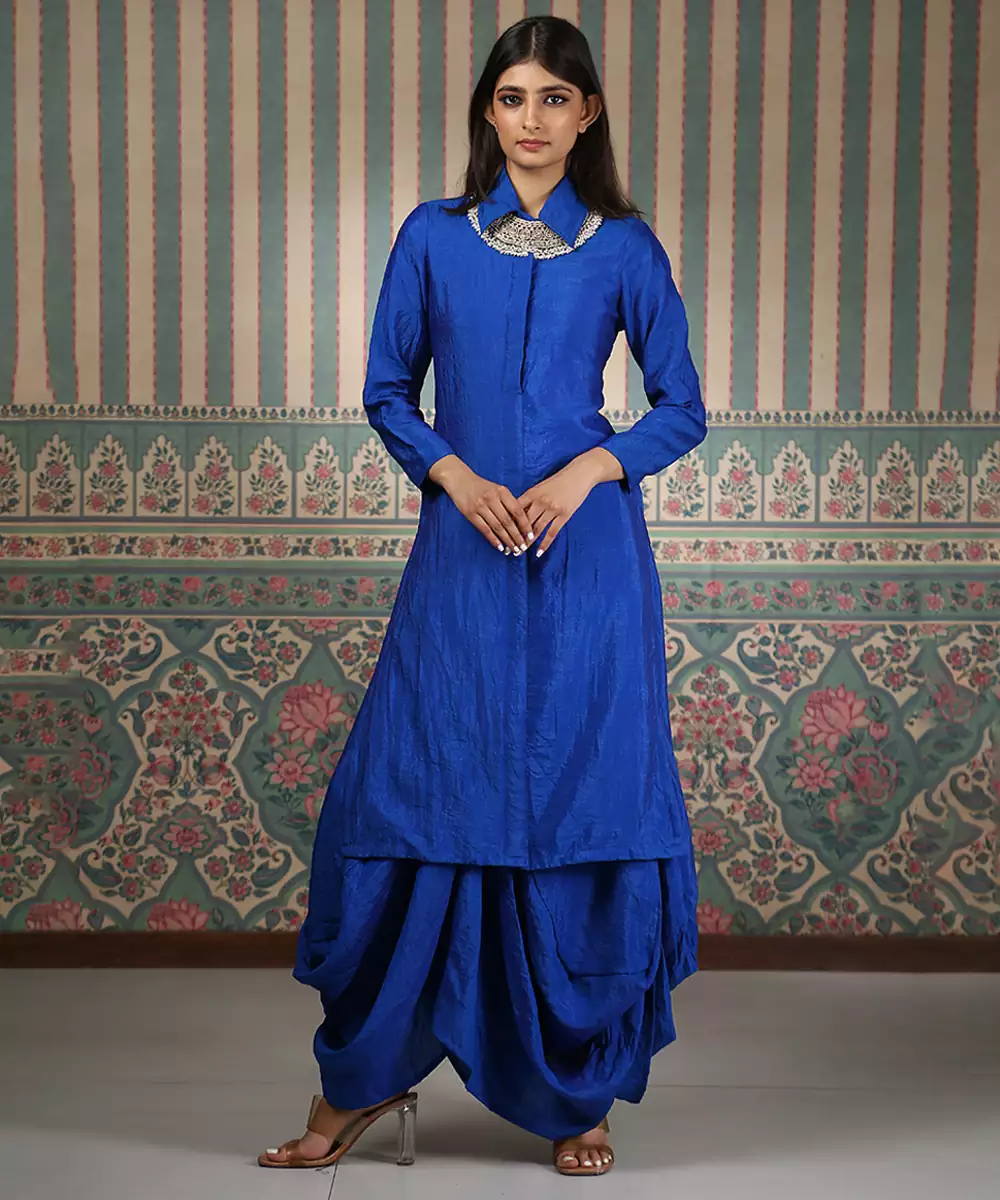 This Blue Embroidered Silk Blend Kurta Set Blends Modern Style With Elegant Craftsmanship. Crafted From A Smooth, Luxurious Silk Blend Fabric, It Features Intricate Embroidery That Adds A Refined Touch. Perfect For Festive Gatherings And Special Occasions, It Offers A Flattering Fit, Comfort, And Contemporary Ethnic Charm.