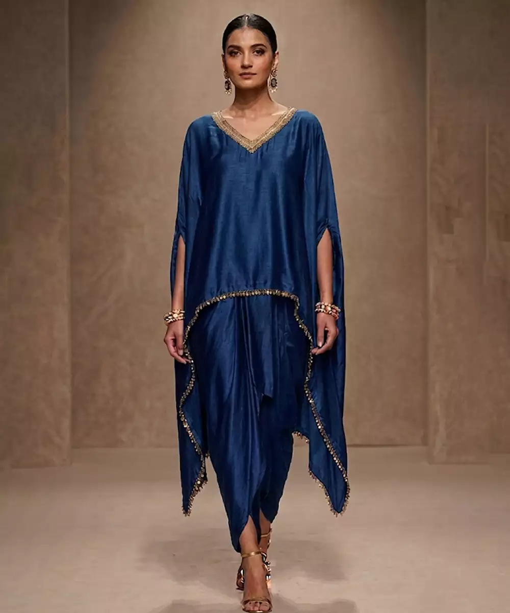 This Blue Embroidered Modal Satin Kaftan Features A Sleek Finish With Elegant Detailing. The Soft, Flowy Fabric Drapes Beautifully, Offering Comfort And Style. Perfect For Casual And Festive Wear, It Adds A Refined And Contemporary Touch To Your Wardrobe.