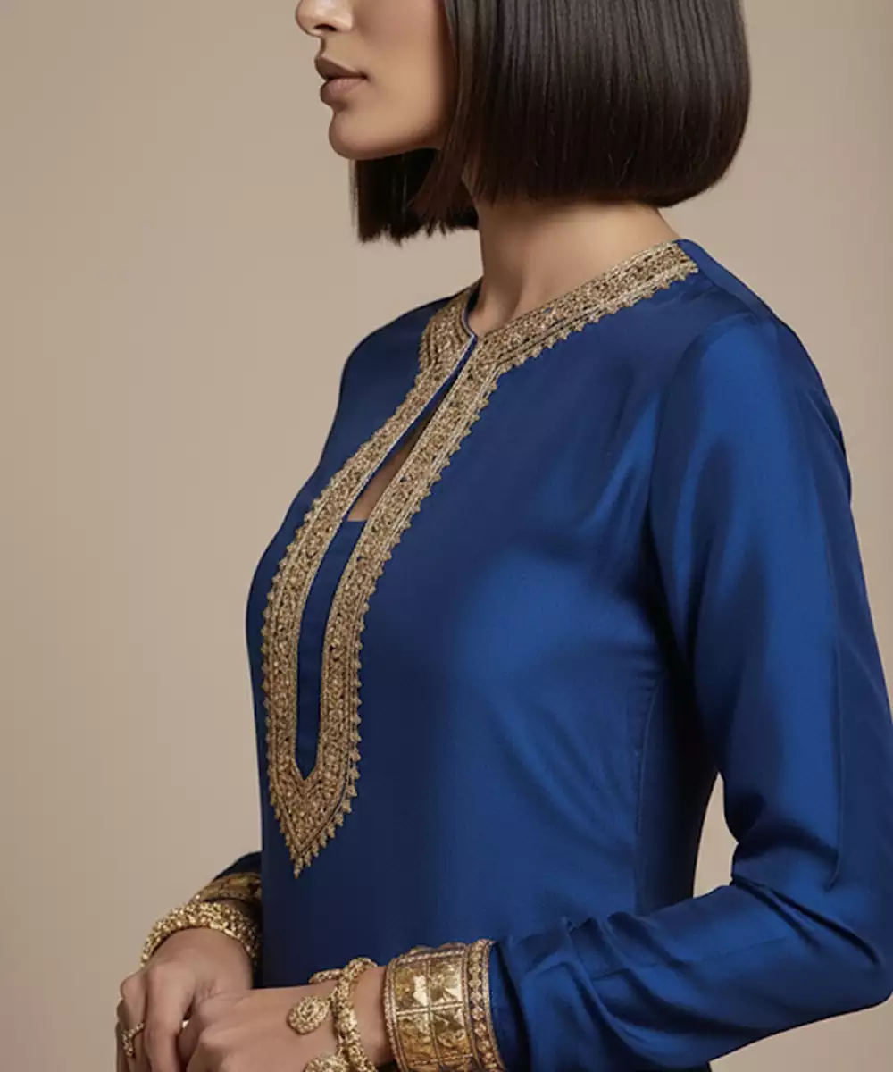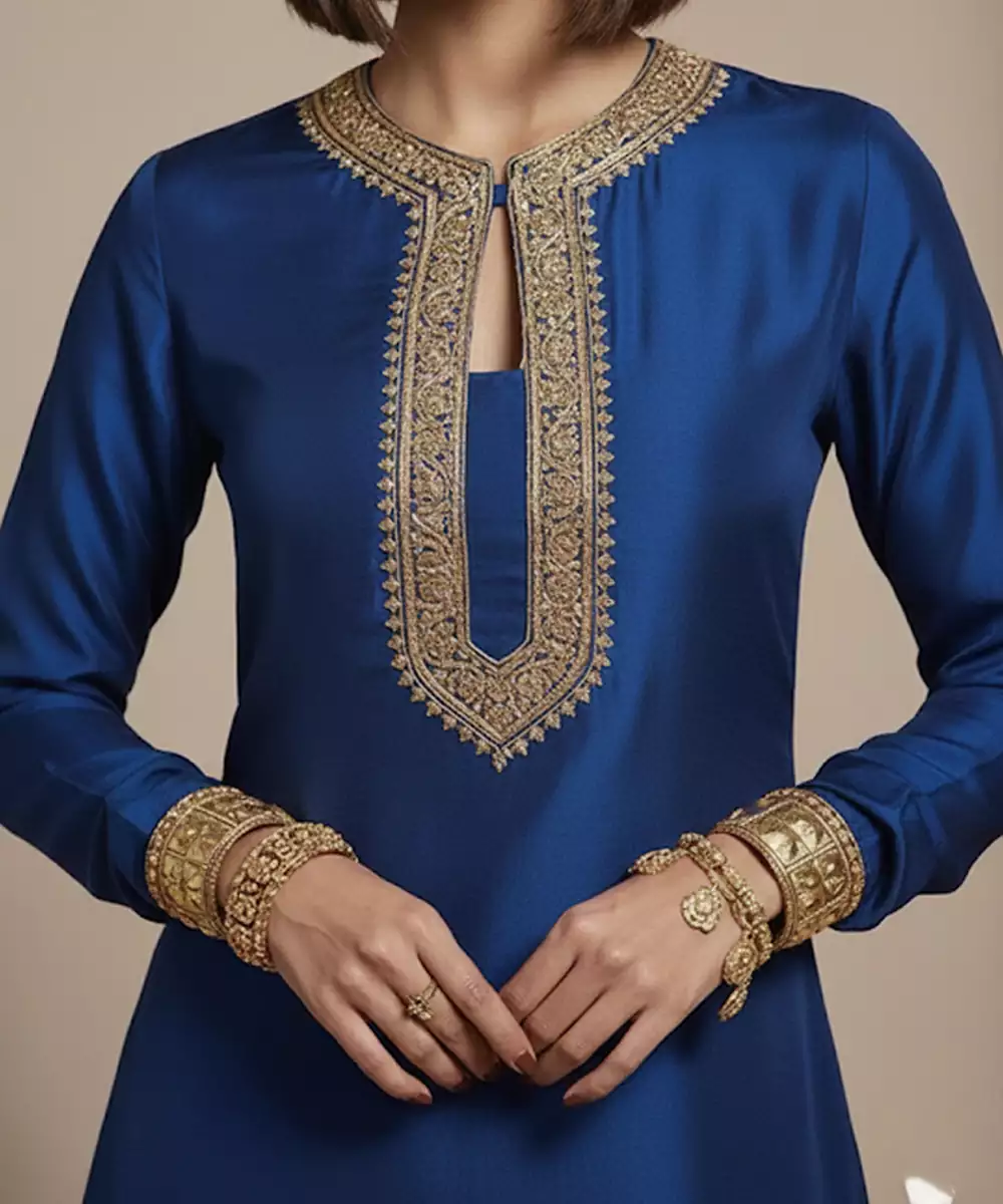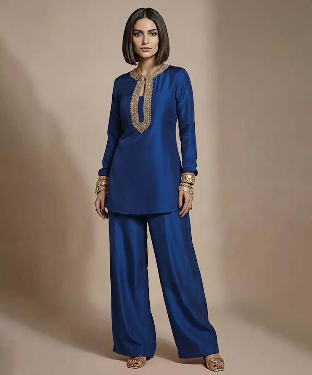 An Elegant Blue Raw Silk Co Ord Set Adorned With Refined Embroidery For A Regal Finish. The Luxurious Texture And Structured Drape Create A Polished Look, While The Contemporary Co Ord Styling Keeps It Versatile. Ideal For Festive Evenings, Family Celebrations, And Semi Formal Ethnic Wear.