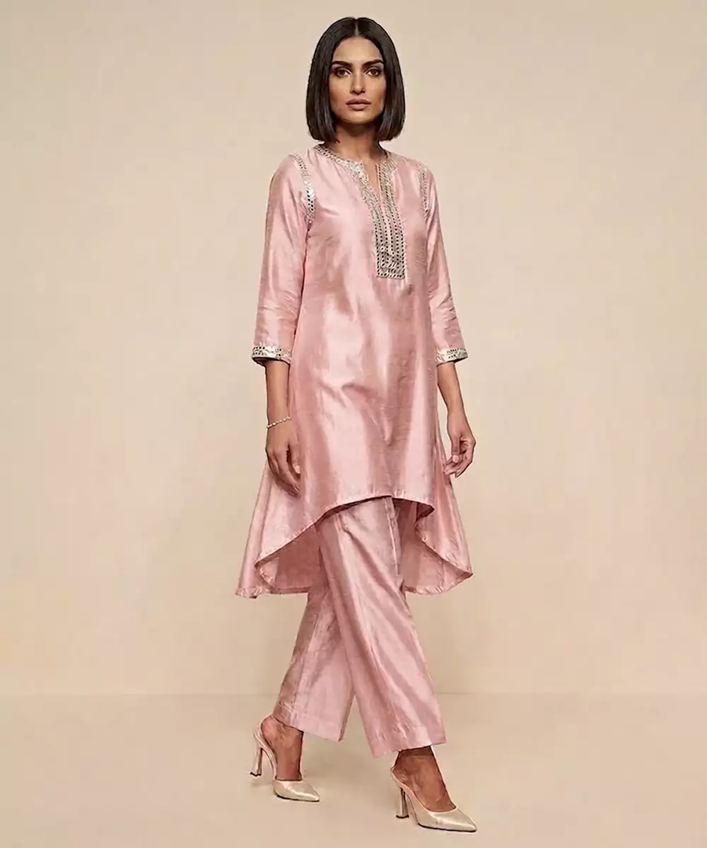 This Blush Pink Raw Silk Kurta Set Features Fine Embroidery That Adds A Soft And Feminine Charm. The Luxurious Fabric Ensures Comfort With An Elegant Drape. Perfect For Festive Occasions, It Pairs Beautifully With Delicate Accessories For A Graceful And Refined Appearance.