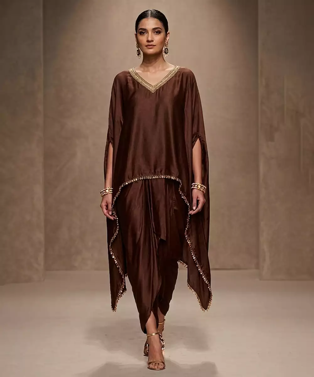 This Brown Modal Satin Kaftan Showcases Intricate Embroidery That Enhances Its Rich And Elegant Appeal. The Smooth Fabric Drapes Beautifully, Offering Comfort And Style. Ideal For Festive Occasions Or Relaxed Gatherings, It Pairs Effortlessly With Minimal Accessories For A Refined And Contemporary Look.
