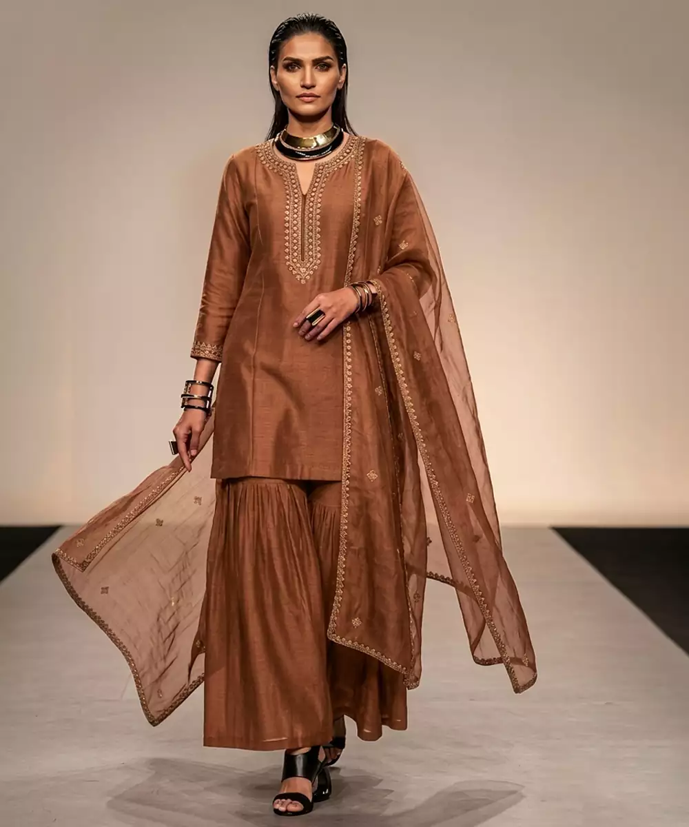 This Brown Raw Silk Sharara Set Showcases Intricate Embroidery That Enhances Its Earthy Elegance. The Rich Fabric Offers Structure And A Graceful Drape, While The Flared Sharara Adds Movement. Ideal For Festive Occasions, It Pairs Beautifully With Statement Accessories For A Sophisticated Look.