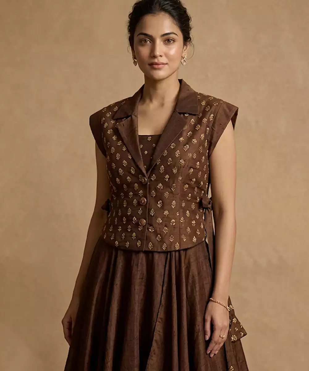 This Brown Raw Silk Lehenga Set Showcases Elegant Prints That Add Depth And Charm To Its Rich Texture. Designed For Comfort And Style, It Offers A Flattering Silhouette With A Graceful Fall. Ideal For Festive Gatherings, It Pairs Beautifully With Subtle Accessories For A Refined And Contemporary Look.