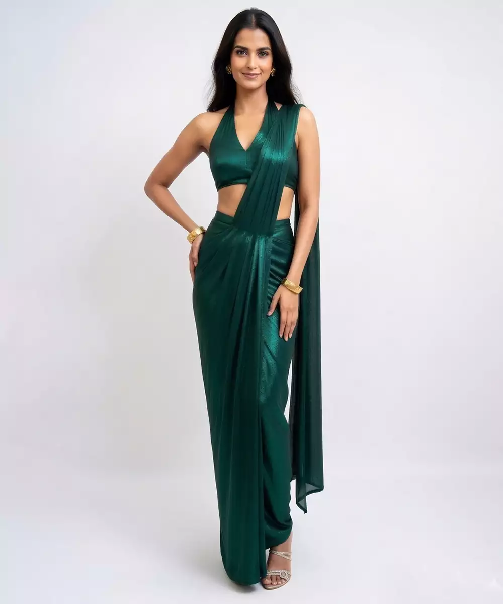 This Emerald Green Lycra Pre Draped Saree Showcases Intricate Embellishments That Enhance Its Rich And Glamorous Appeal. The Stretchable Fabric Offers Comfort And A Sleek Silhouette, While The Ready Design Ensures Effortless Wear. Ideal For Parties Or Festive Occasions, It Pairs Beautifully With Bold Accessories For A Striking Look.