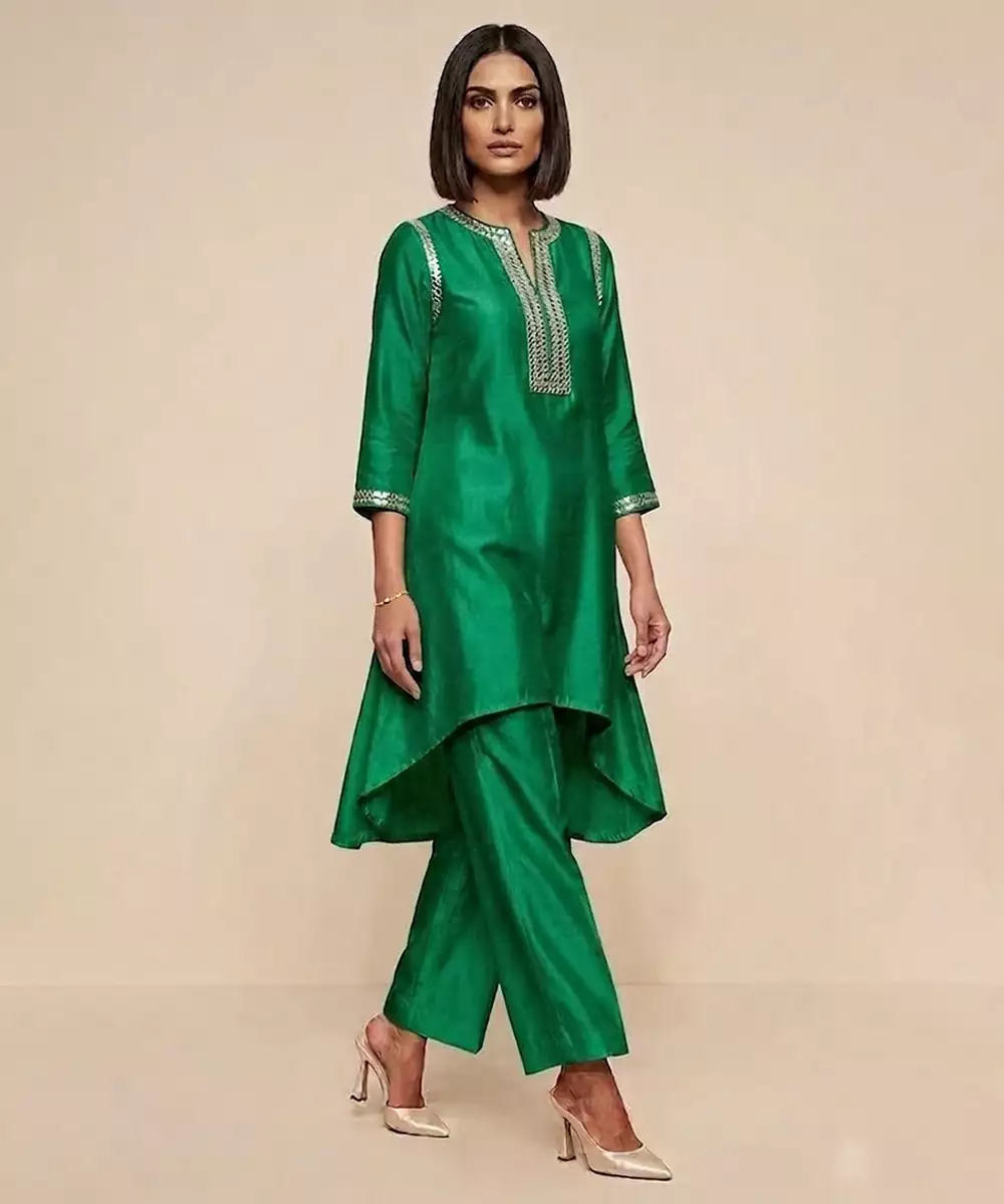 This Emerald Green Raw Silk Kurta Set Features Intricate Embroidery That Enhances Its Rich And Regal Appeal. The Luxurious Fabric Offers A Structured Yet Comfortable Fit, While The Elegant Silhouette Adds Grace. Perfect For Festive Occasions, It Pairs Beautifully With Traditional Accessories For A Refined And Timeless Look.