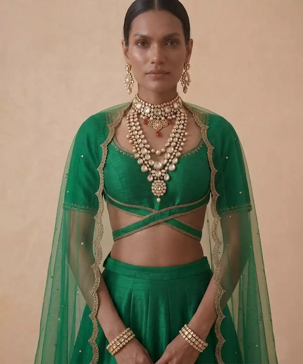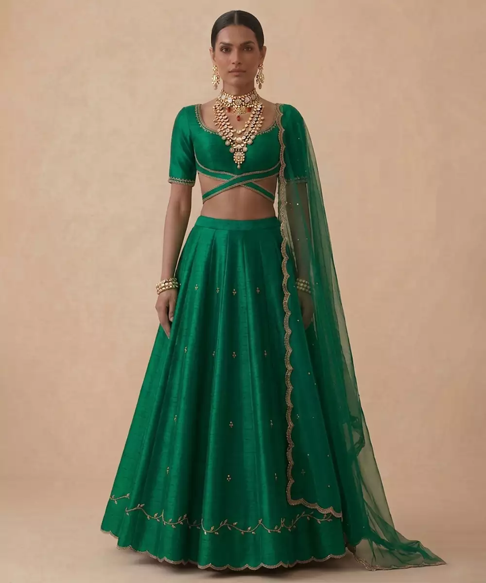 This Emerald Green Raw Silk Lehenga Set Showcases Intricate Embroidery That Enhances Its Regal Charm. The Rich Texture And Structured Silhouette Create A Graceful Fall. Ideal For Weddings And Festive Occasions, It Pairs Beautifully With Traditional Jewelry For A Timeless And Elegant Appearance.