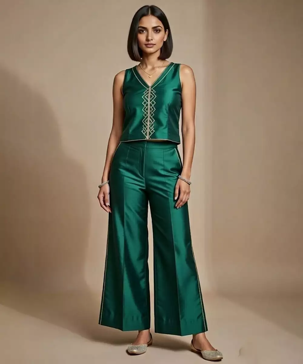 This Emerald Green Embroidered Satin Co Ord Set Reflects Luxurious Style With Rich Color And Intricate Detailing. The Smooth Satin Fabric Adds A Subtle Sheen While Elegant Embroidery Enhances Its Festive Sophistication. Designed With Coordinated Pieces, It Is Perfect For Weddings, Celebrations, And Special Occasions.