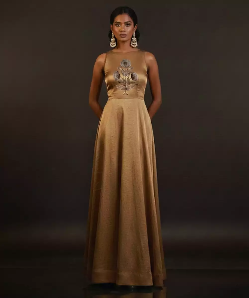 Elegant Gold Embroidered Tissue Gown Crafted In A Lightweight, Sheer Fabric With A Subtle Metallic Sheen. Intricate Embroidery Adds Rich Texture And Festive Charm. Designed With A Graceful Flow And Refined Silhouette, This Gown Is Perfect For Weddings, Receptions, Festive Celebrations, And Glamorous Evening Occasions.
