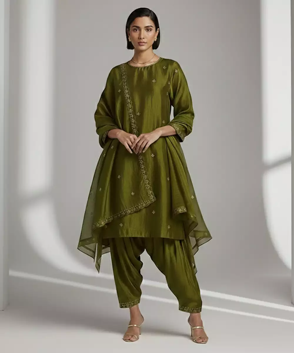 "A Graceful Green Chanderi Kurta Set Highlighted With Intricate Embroidery For A Refined Traditional Look. The Breathable Fabric Offers All Day Comfort While Maintaining A Rich Appearance. Paired With Complementing Bottoms, It Suits Festive Events, Pujas, And Elegant Daytime Occasions Beautifully.